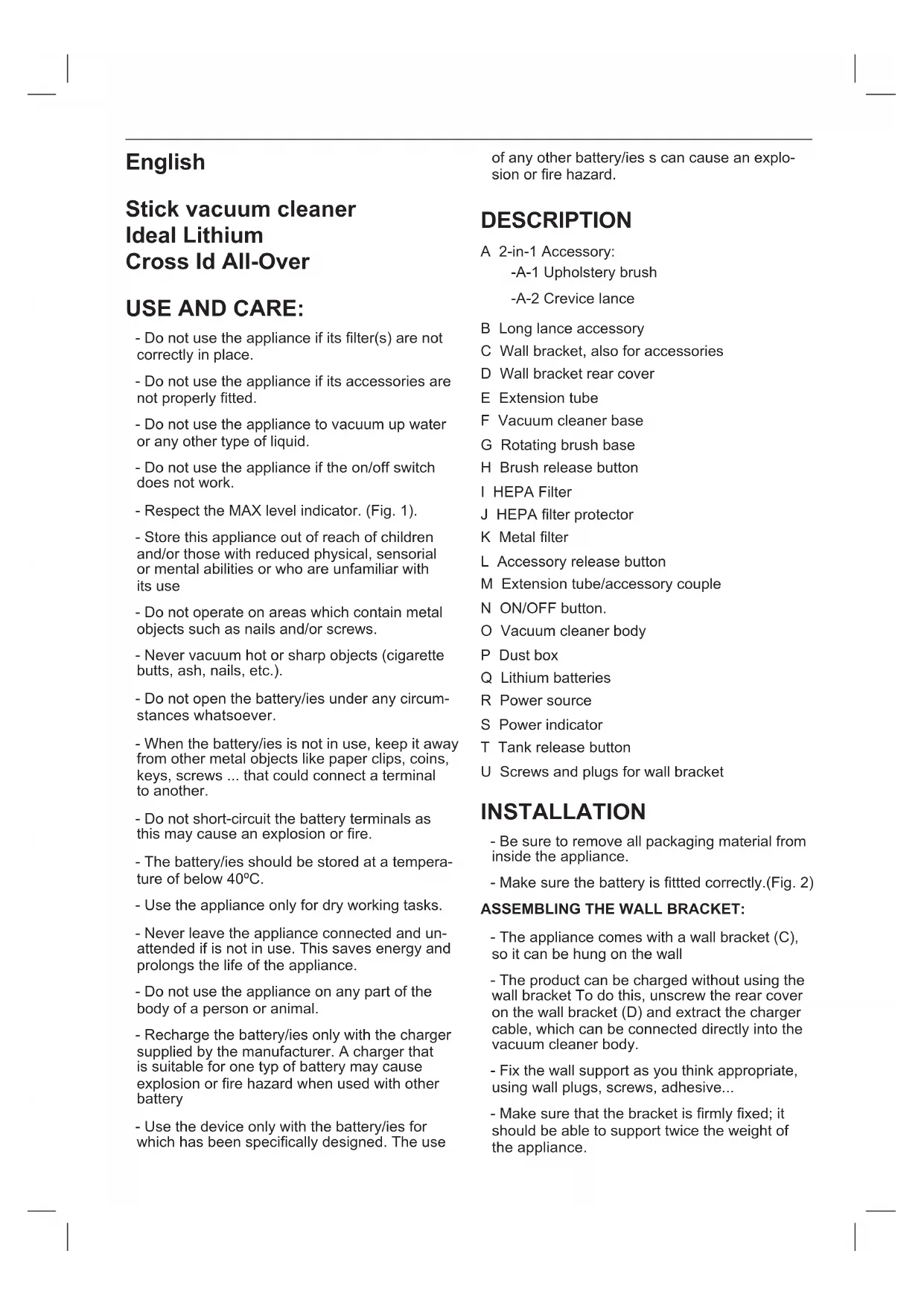 TUBE: - The hand-held vacuum cleaner and the exten- sion tube are designed in such a way to allow the following accessories to be tted: (use the combination that best meets your require- ments). (Fig. 4). - 2-in-1 Accessory: -A-1 Upholstery brush -A-2 Crevice lance - Long lance