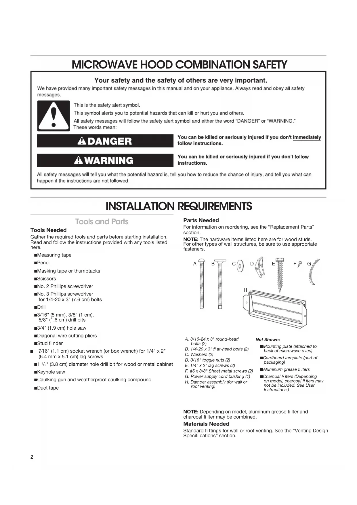 " (3.8 cm) diameter hole drill bit for wood or metal cabinet ■ Keyhole saw ■ Caulking gun and weatherproof caulking compound ■ Duct tape Parts Needed For information on reordering, see the “Replacement Parts” section. NOTE: The hardware items listed here are for wood studs. For other types of wall structures, be sure to use appropriate fasteners. NOTE: Depending on model, aluminum grease lter and charcoal lter may be combined. Materials Needed Standard ttings for wall or roof venting. See the “Venting Design Speci cations” section.