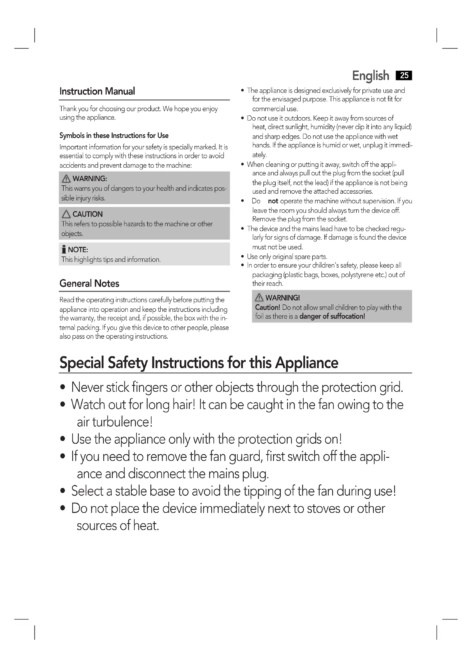 - Watch out for long hair! It can be caught in the fan owing to the air turbulence!