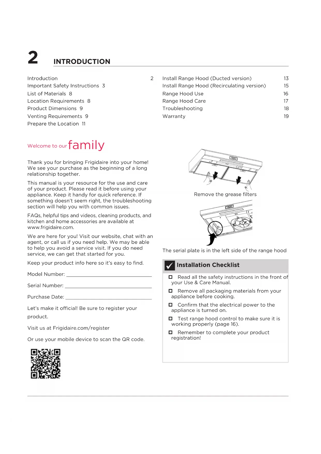 Frigidaire.com USA 1-800-374-4432 Frigidaire.ca Canada 1-800-265-8352 A06823702 (Oct 2022) LIB0185290 RANGE HOOD use care Installation Instructions2 INTRODUCTION INTRODUCTION Welcome to our family Thank you for bringing Frigidaire into your home! We see your purchase as the beginning of a long relationship together. This manual is your resource for the use and care of your product. Please read it before using your appliance. Keep it handy for quick reference. If something doesn’t seem right, the troubleshooting section will help you with common issues. FAQs, helpful tips and videos, cleaning products, and kitchen and home accessories are available at www.frigidaire.com. We are here for you! Visit our website, chat with an agent, or call us if you need help. We may be able to help you avoid a service visit. If you do need service, we can get that started for you. Keep your product info here so it’s easy to find. Model Number: Serial Number: Purchase Date: Let’s make it ocial! Be sure to register your product. Visit us at Frigidaire.com/register Or use your mobile device to scan the QR code. Read all the safety instructions in the front of your Use & Care Manual. Remove all packaging materials from your appliance before cooking. Confirm that the electrical power to the appliance is turned on. Test range hood control to make sure it is working properly (page 16). Remember to complete your product registration! Installation Checklist Remove the grease filters The serial plate is in the left side of the range hood Introduction 2 Important Safety Instructions 3 List of Materials 8 Location Requirements 8 Product Dimensions 9 Venting Requirements 9 Prepare the Location 11 Install Range Hood (Ducted version) 13 Install Range Hood (Recirculating version) 15 Range Hood Use 16 Range Hood Care 17 Troubleshooting 18 Warranty 193 Important Safety InStructIonS Important Safety InStructIonS Read all instructions before using this appliance. Save these instructions for future references Approved for residential appliances For residential use only This manual contains important safety symbols and instructions. Please pay attention to these symbols and follow all instructions given. Do not attempt to install or operate your appliance until you have read the safety precautions in this manual. Safety items throughout this manual are labeled with a WARNING or CAUTION statement based on the risk type. Warnings and important instructions appearing in this guide are not meant to cover all possible conditions and situations that may occur. Common sense, caution, and care must be exercised with installing, maintaining, or operating your appliance. Always wear work gloves for all installation and maintenance operations defInItIonS This is the safety alert symbol. It is used to alert of potential personal injury hazards. Obey all safety messages that follow this symbol to avoid possible injury or death. WarnInG This symbol alerts you to situations that may cause serious body harm, death or property damage. cautIon Indicates a potentially hazardous situation which, if not avoided, may result in minor or moderate injury. Important Indicates installation, operation or maintenance information which is important but not hazard-related. note Indicates a short, informal reference – something written down to assist the memory or for future reference.4