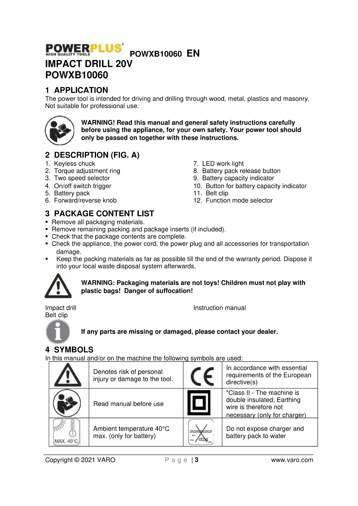 VARO – Vic. Van Rompuy N.V. - Joseph Van Instraat 9 - BE2500 Lier - BELGIUM, declares that, Product: Impact drill 20V - Battery Operated Trade mark: PowerPlus Model: POWXB10060 is in conformity with the essential requirements and other relevant provisions of the applicable European Directives, based on the application of European harmoniz195ed standards. Any unauthorized modification of the apparatus voids this declaration. European Directives (including, if applicable, their amendments up to the date of signature); 2011/65/EU 2006/42/EC 2014/30/EU European harmonized standards (including, if applicable, their amendments up to the date of signature); EN62841-1 : 2015 EN62841-2-1 : 2018 EN55014-1 : 2017 EN55014-2 : 2015 Keeper of the Technical Documentation : Philippe Vankerkhove, VARO – Vic. Van Rompuy N.V. The undersigned acts on behalf of the company CEO, Philippe Vankerkhove Regulatory Affairs – Compliance Manager 21/01/2021, Lier - BelgiumPOWXB10060 DE Copyright © 2021 VARO S e i t e | 1 www.varo.com 1 EINSATZBEREICH ......................................................................... 3