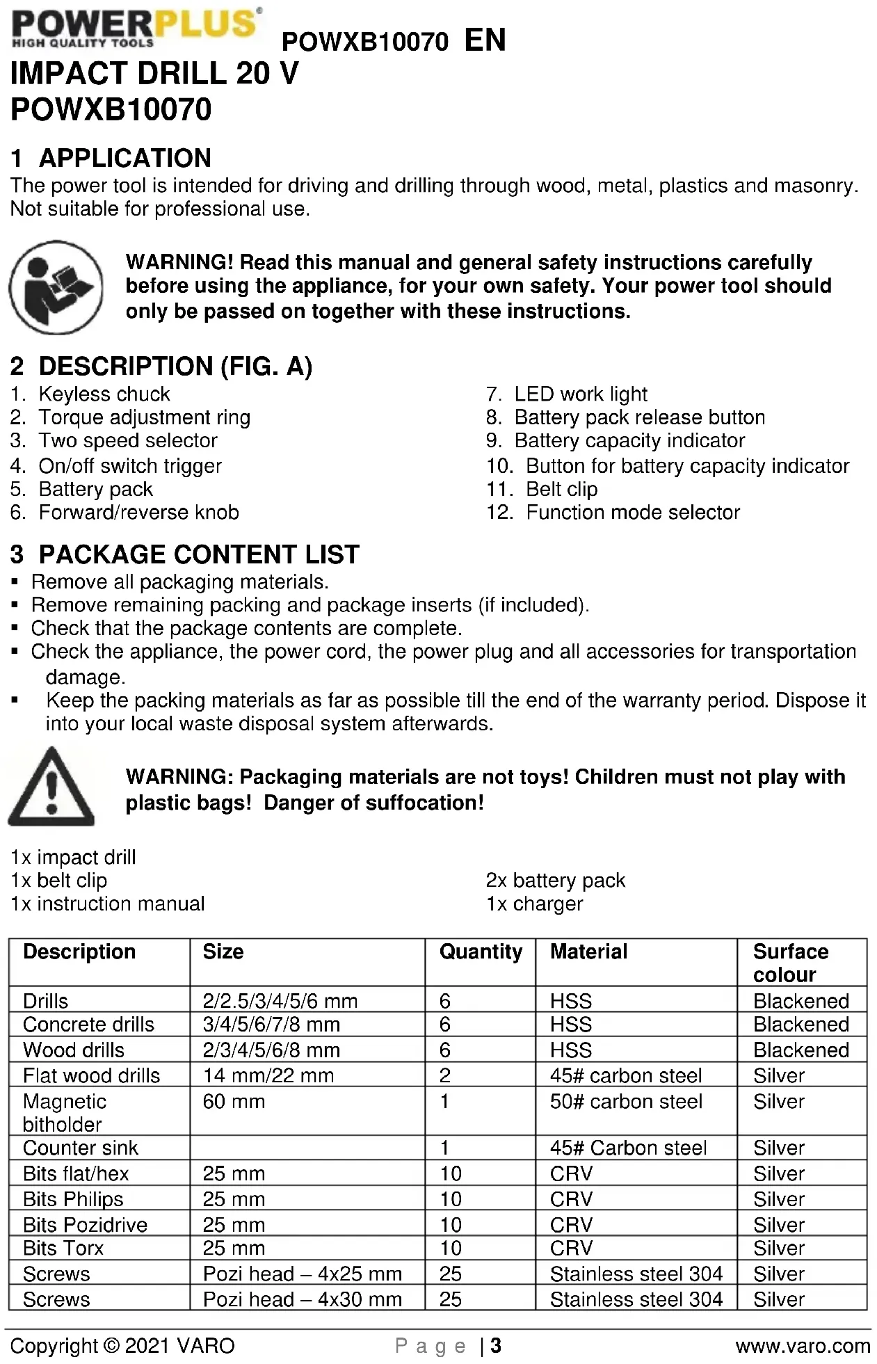 - Our machines have been designed to operate over a long period of time with a minimum of maintenance. Continuous satisfactory operation depends upon proper machine care and regular cleaning. 12 TECHNICAL DETAILS Chuck 13 mm keyless Power supply 20 Volt DC Gear Train 2 Speed Rotation Speed 0-400/0-1300 min-1 Impact Rate 0-6000/0-19500 ipm Clutch 22+1+1 Positions Torque 30Nm (MAX.) 13 NOISE Noise emission values measured according to relevant standard. (K=5) Acoustic pressure level LpA 71 dB(A) Acoustic power level LwA 82 dB(A) ATTENTION! Wear hearing protection when sound pressure is over 85 dB(A). aw (Vibration) Max 3,6 m/s² K = 1,5 m/s²POWXB10070 EN Copyright © 2021 VARO P a g e | 13 www.varo.com 14 WARRANTY