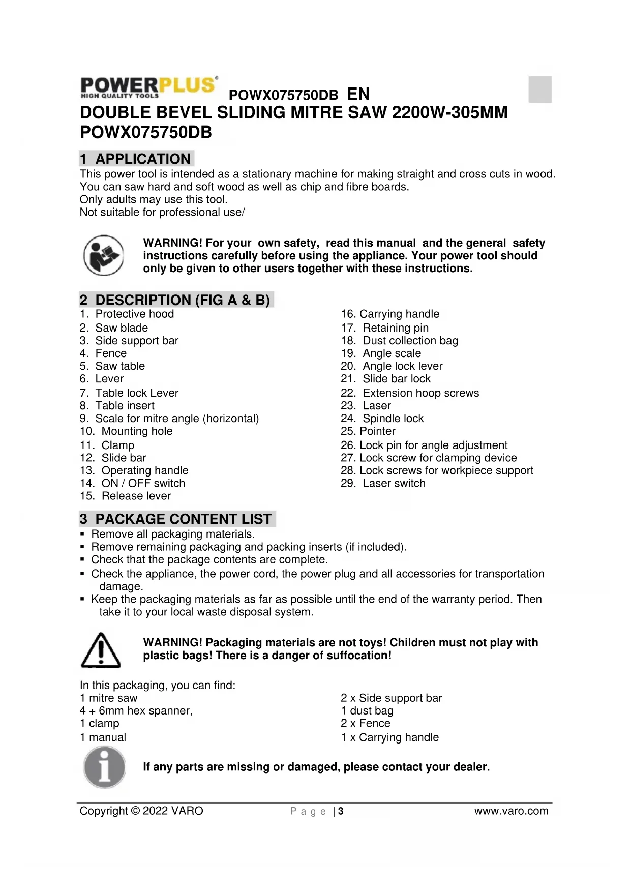 - Keep the packaging materials as far as possible until the end of the warranty period. Then take it to your local waste disposal system. WARNING! Packaging materials are not toys! Children must not play with plastic bags! There is a danger of suffocation! In this packaging, you can find: 1 mitre saw 4 + 6mm hex spanner, 1 clamp 1 manual 2 x Side support bar 1 dust bag 2 x Fence 1 x Carrying handle If any parts are missing or damaged, please contact your dealer.POWX075750DB EN Copyright © 2022 VARO P a g e | 4 www.varo.com 4 SYMBOLS The following symbols are used in this manual and/or on the machine: