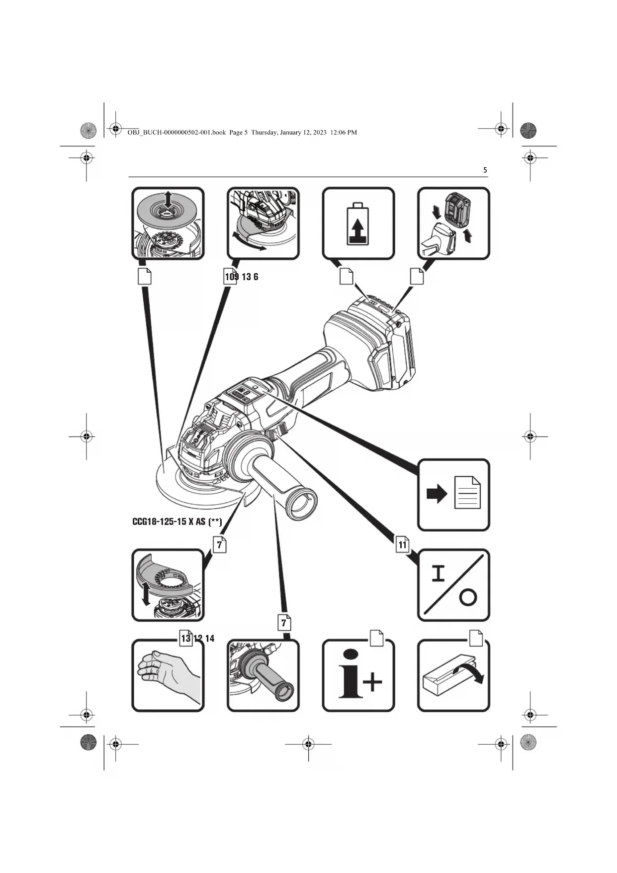 For an accurate estimation of vibration and noise expo- sure, the durations when the equipment is switched off or running but not actually in use should also be taken into account. This may significantly reduce the vibration and noise exposure over the total working period. Identify additional safety measures to protect the operator from the effects of vibration and noise such as: Maintain the power tool and the accesso- ries, keep the hands warm, organization of work patterns. Handling hazardous dusts For work procedures with this power tool where material is removed, dusts develop that can be hazard- ous to one’s health. Contact with or inhaling some dust types, e. g. asbestos and asbestos-containing materials, lead-containing coat- ings, metal, some wood types, minerals, silicate parti- cles from materials containing stone, paint solvents, wood preservatives, antifouling paints for vessels, can trigger allergic reactions to the operator or bystanders and/or lead to respiratory infections, cancer, birth defects or other reproductive harm. The risk from inhaling dusts depends on the exposition. Use dust extraction matched appropriately for the developing dust, as well as personal protective equipment and pro- vide for good ventilation of the workplace. Leave the processing of asbestos-containing materials to special- ists. Wood and light-metal dust, hot mixtures of grinding dust and chemical materials can self-ignite under unfa- vourable conditions or cause an explosion. Avoid sparking in the direction of the dust collector as well as overheating of the power tool and the materials being sanded, empty the dust collector/container in time, observe the material manufacturer’s working instruc- tions, as well as the relevant regulations in your country for the materials being worked. Operating Instructions. Do not use the power tool with a cut-off stand. After heavily straining the power tool, continue to run it at no-load for several minutes in order to cool the application tool down. Mounting/dismounting the application tool CCG18-125-15 AS (**): Press the locking button only when the motor is stopped (see page 8). Otherwise the power tool may be damaged. An O-ring is fitted around the centring collar of clamping flange. If this is missing or damaged, it is essential that the O-ring is replaced before further use. Mounting/dismounting the application tool CCG18-125-15 X AS (**): Only use original X-LOCK insert tools that are labelled with the X-LOCK logo. Only original X- LOCK application tools ensure that the clamping thick- ness of max. 1.6 mm is maintained. A higher clamping thickness can lead to insecure clamping, which can cause the application tool to become loose. Ensure that the application tool and the holder are not deformed and are free of debris and particles. Observe the dimensions of the grinding tools. Ensure that both X-LOCK latch noses are open before mounting the X-LOCK application tool. If nec- essary, clean the area between the two X-LOCK latch noses. After mounting, check that the edge of the grind- ing accessory is not higher than the reference sur- face and thus correctly mounted. If the edge is higher, the mount must be cleaned or the grinding accessory may not be used. Press the lever (see page 9) only when the motor is stopped. Do not switch the power tool on with the clamp- ing lever open. Otherwise there is a risk of crush- ing the hand and fingers. Do not reach into the area of the clamping jaws. Otherwise there is a risk of crushing the fingers. Features The soft start is used to reduce torque reaction forces when switching on and running up the power tool to the no-load speed. The restarting protection prevents the power tool from automatically restarting if the power supply is inter- rupted during operation. In this case, switch off the power tool, check the power supply and then switch the power tool on again. The electronic overload protection reduces the risk of motor damage if the power tool is overloaded. Pro- longed blocking (> 1 s) of the application tool leads to automatic switching off of the power tool. Afterwards, set the switch to the off position, remove the power tool from the workpiece and check the application tool for damage. Then, switch the power tool on again. The electronic speed preselection enables the speed to be adapted to the respective application and the respec- tive application tool. The kickback monitoring reduces the risk of unex- pected kickback of the power tool. In this case, the power tool switches off automatically. Afterwards, set the switch to the off position, remove the power tool from the workpiece and check the application tool for damage. Afterwards, switch the power tool on again. The fall down monitoring reduces the danger posed by a falling power tool.In this case, the power tool switches off automatically.Afterwards, set the switch to the off position and check the application tool for dam- age. Then, switch the power tool on again. The power tool is equipped with a brake system for braking down the application tool. This reduces the risk of accidents. OBJ_BUCH-0000000502-001.book Page 3 6 Thursday, January 12, 2023 12:06 PM37