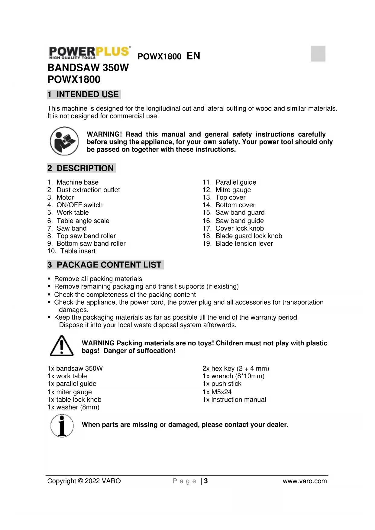 - Keep the packaging materials as far as possible till the end of the warranty period. Dispose it into your local waste disposal system afterwards. WARNING Packing materials are no toys! Children must not play with plastic bags! Danger of suffocation! 1x bandsaw 350W 1x work table 1x parallel guide 1x miter gauge 1x table lock knob 1x washer (8mm) 2x hex key (2 + 4 mm) 1x wrench (8*10mm) 1x push stick 1x M5x24 1x instruction manual When parts are missing or damaged, please contact your dealer.POWX1800 EN Copyright © 2022 VARO P a g e | 4 www.varo.com 4 SYMBOLS In this manual and/or on the machine the following symbols are used: