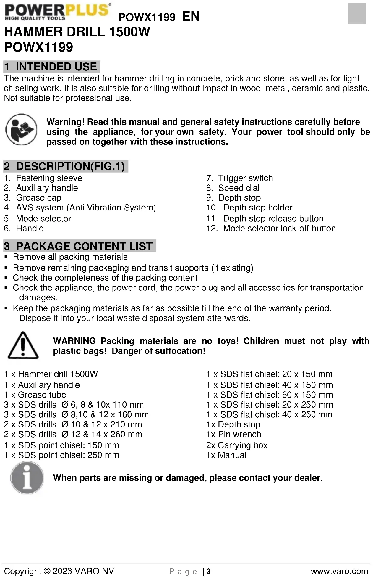 - Keep the packaging materials as far as possible till the end of the warranty period. Dispose it into your local waste disposal system afterwards. WARNING Packing materials are no toys! Children must not play with plastic bags! Danger of suffocation! 1 x Hammer drill 1500W 1 x Auxiliary handle 1 x Grease tube 3 x SDS drills Ø 6, 8 & 10x 110 mm 3 x SDS drills Ø 8,10 & 12 x 160 mm 2 x SDS drills Ø 10 & 12 x 210 mm 2 x SDS drills Ø 12 & 14 x 260 mm 1 x SDS point chisel: 150 mm 1 x SDS point chisel: 250 mm 1 x SDS flat chisel: 20 x 150 mm 1 x SDS flat chisel: 40 x 150 mm 1 x SDS flat chisel: 60 x 150 mm 1 x SDS flat chisel: 20 x 250 mm 1 x SDS flat chisel: 40 x 250 mm 1x Depth stop 1x Pin wrench 2x Carrying box 1x Manual When parts are missing or damaged, please contact your dealer.POWX1199 EN Copyright © 2023 VARO NV P a g e | 4 www.varo.com 4 SYMBOLS In this manual and/or on the machine the following symbols are used: