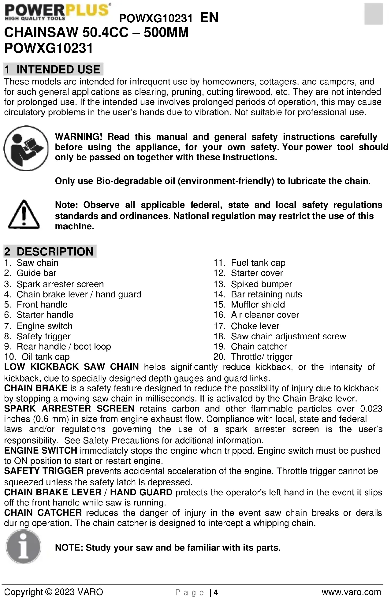 Guide bar type Sprocket nose Carburettor type Walbro Spark plug type Champion Cutting length 500mm Engine power 2kW CDI ignition Yes Controlled oil delivery Yes Crank engine Full E10 fuel proof Yes Easy start system Yes Engine type 2-stroke Fuel mixing ratio 1:40 Fuel tank capacity 520ml Oil tank capacity 250ml High power engine Yes Long life air filter system yes Low kickback Yes Low vibration system Yes Primer bulb Yes Quick stop Yes Safety trigger throttle latch Yes Shock absorber Yes Auto-brake hand guard Yes Automatic chain oiler Yes Automatic choke switch off Yes Automatic lubrication Yes 14 NOISE Noise emission values measured according to relevant standard. (K=3) Acoustic pressure level LpA 102dB(A) Acoustic power level LwA 113dB(A) ATTENTION! Wear hearing protection when sound pressure is over 85 dB(A). Vibration 13.3m/s² K = 1.5 m/s²POWXG10231 EN Copyright © 2023 VARO P a g e | 23 www.varo.com