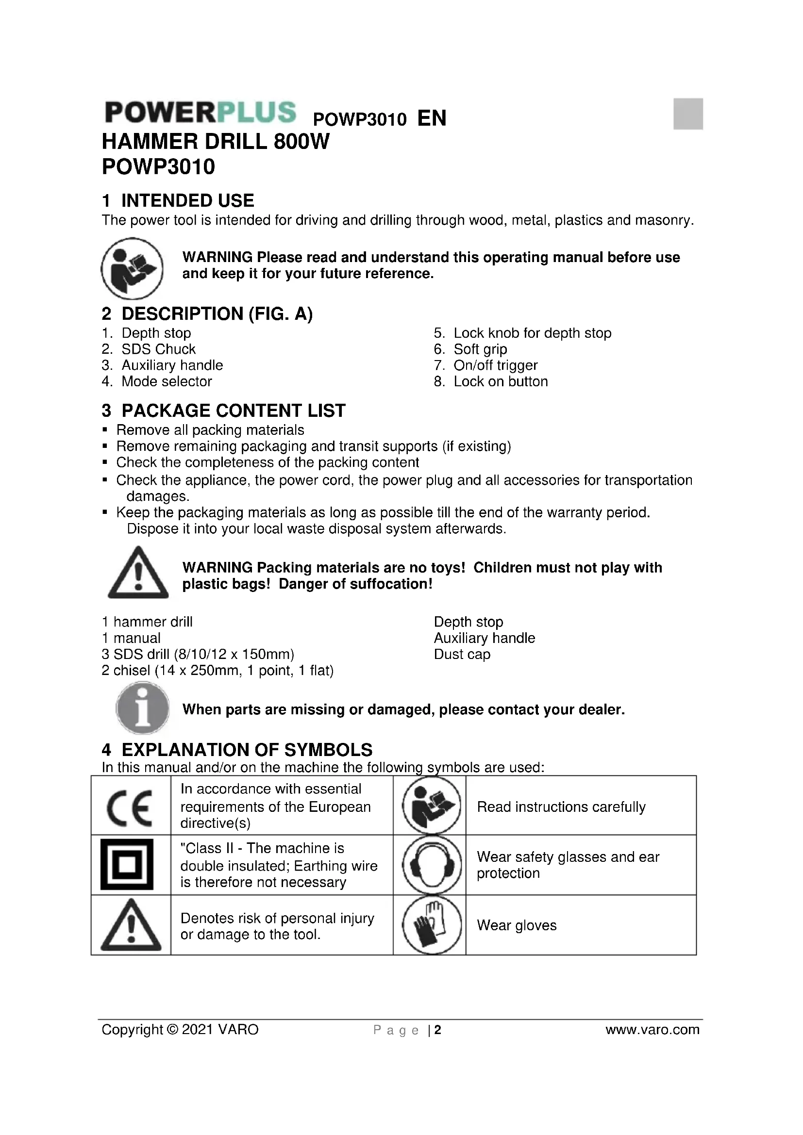 Plug the cord set into power socket. To start the tool squeeze the on/off switch (7). To stop the tool , release the on/off switch. If you press the lock-on button (8) while the on/off switch is depressed, the on/off switch is kept in the operating position. To release the on/off switch (7) again, press it briefly to and turn the tool off. The harder you squeeze the on/off switch (7) the faster the tool will operate. Use lower speeds for starting.POWP3010 EN Copyright © 2021 VARO P a g e | 7 www.varo.com 9 TECHNICAL DATA Model POWP3010 Voltage 230-240 V~ 50 Hz Power Input 800 Watt No load speed 0-1050 min-1 Impact rates 0-4860 min-1 Shank style SDS Max. drilling capacity Concrete 26 mm Steel 13 mm Wood 40 mm Insulation class / II 10 NOISE Noise emission values measured according to relevant standard. (K=3) Acoustic pressure level LpA 91 dB(A) Acoustic power level LwA 102 dB(A) ATTENTION! Wear hearing protection when sound pressure is over 85 dB(A). aw (Vibration) 8,5 m/s² K = 1.5 m/s² 11 MAINTENANCE