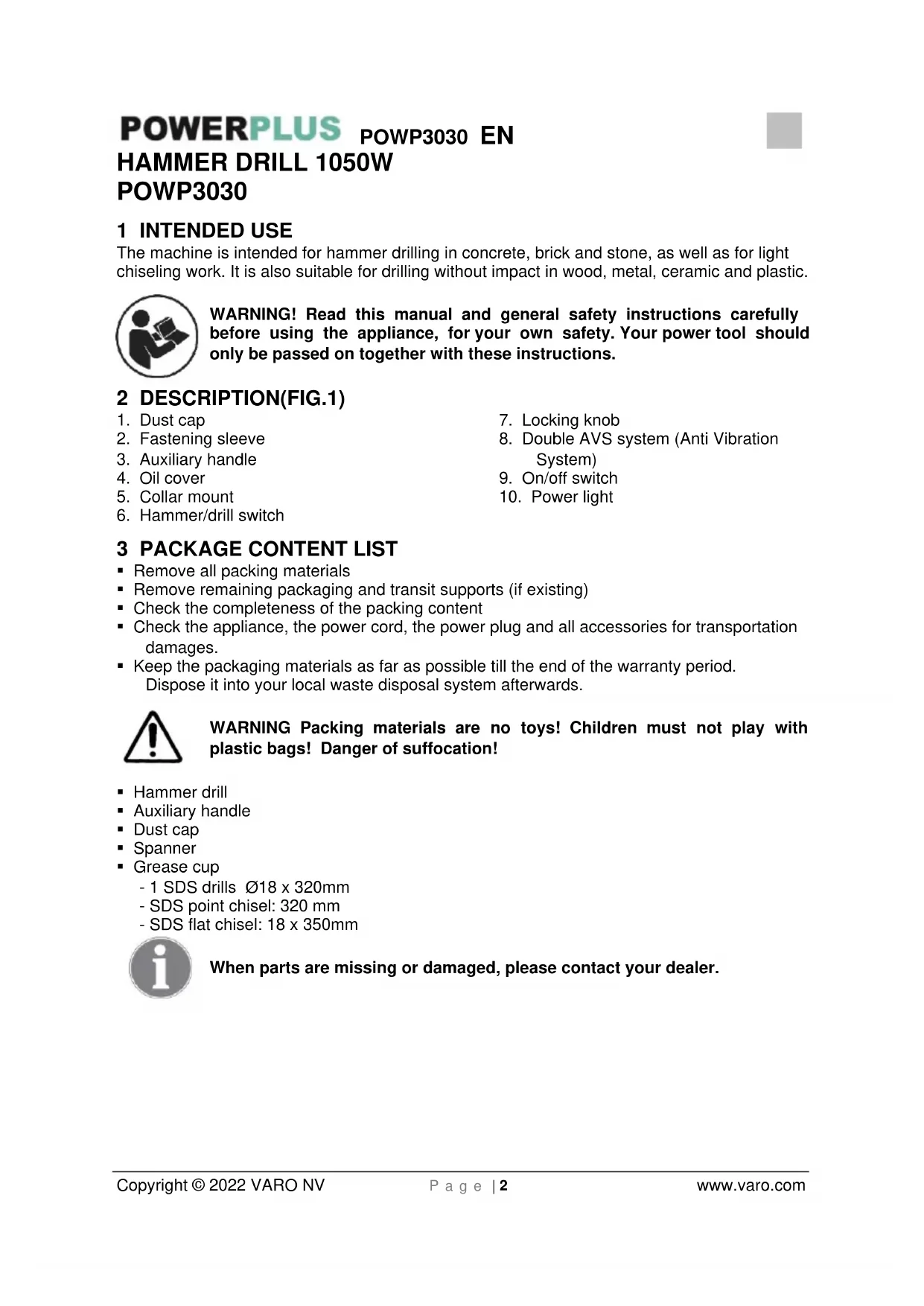 - Grease cup - 1 SDS drills Ø18 x 320mm - SDS point chisel: 320 mm - SDS flat chisel: 18 x 350mm When parts are missing or damaged, please contact your dealer.POWP3030 EN Copyright © 2022 VARO NV P a g e | 3 www.varo.com 4 SYMBOLS In this manual and/or on the machine the following symbols are used: