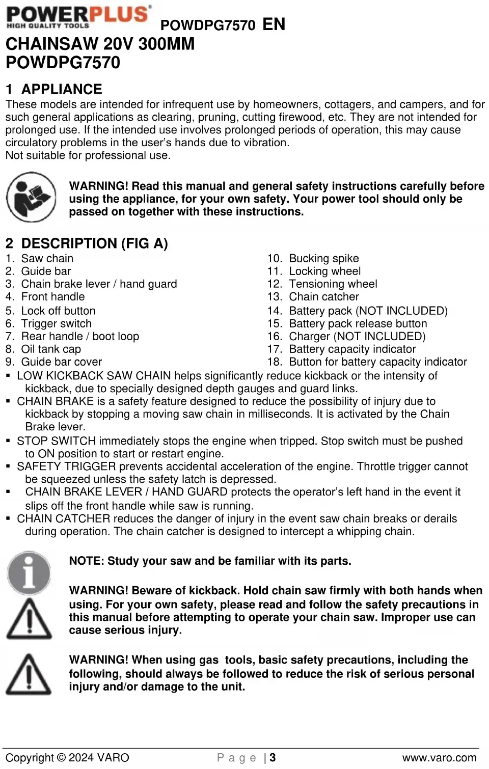 - CHAIN CATCHER reduces the danger of injury in the event saw chain breaks or derails during operation. The chain catcher is designed to intercept a whipping chain. NOTE: Study your saw and be familiar with its parts. WARNING! Beware of kickback. Hold chain saw firmly with both hands when using. For your own safety, please read and follow the safety precautions in this manual before attempting to operate your chain saw. Improper use can cause serious injury. WARNING! When using gas tools, basic safety precautions, including the following, should always be followed to reduce the risk of serious personal injury and/or damage to the unit.POWDPG7570 EN Copyright © 2024 VARO P a g e | 4 www.varo.com