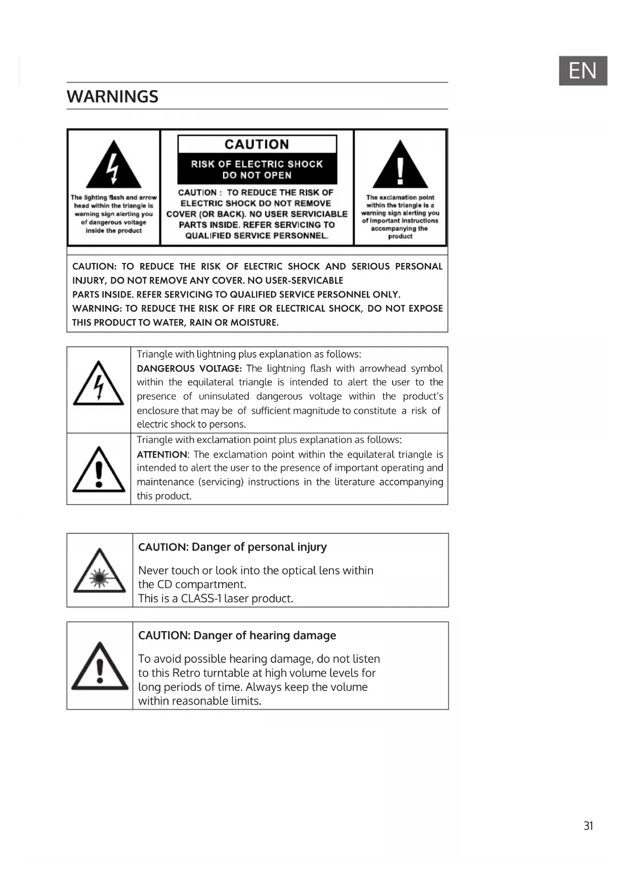 THIS PRODUCT TO WATER, RAIN OR MOISTURE. Triangle with lightning plus explanation as follows: DANGEROUS VOLTAGE: The lightning ash with arrowhead symbol within the equilateral triangle is intended to alert the user to the presence of uninsulated dangerous voltage within the product‘s enclosure that may be of suicient magnitude to constitute a risk of electric shock to persons. Triangle with exclamation point plus explanation as follows: ATTENTION: The exclamation point within the equilateral triangle is intended to alert the user to the presence of important operating and maintenance (servicing) instructions in the literature accompanying this product. CAUTION: Danger of personal injury Never touch or look into the optical lens within the CD compartment. This is a CLASS-1 laser product. CAUTION: Danger of hearing damage To avoid possible hearing damage, do not listen to this Retro turntable at high volume levels for long periods of time. Always keep the volume within reasonable limits.32