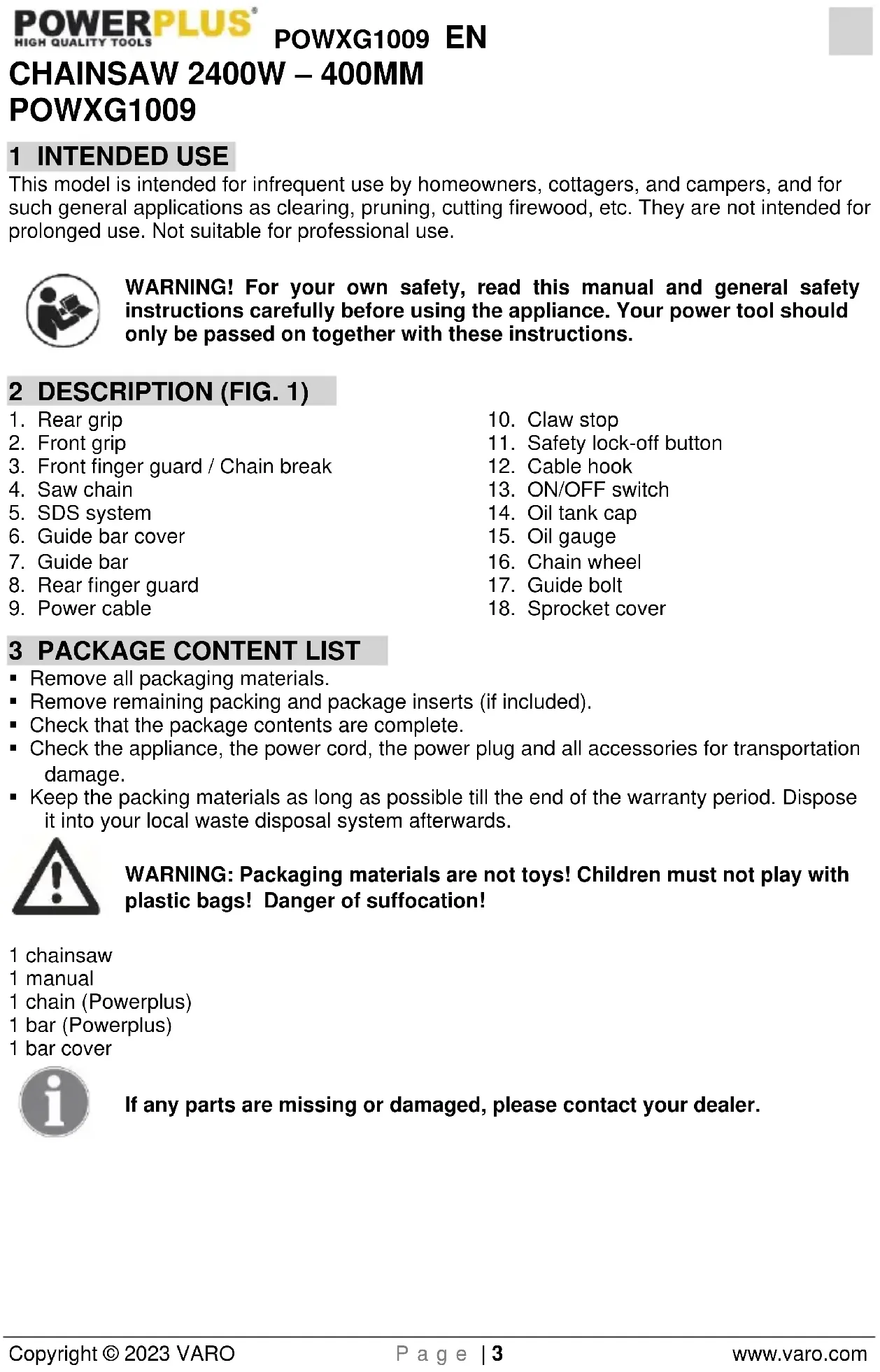 POWXG1009 1 INTENDED USE This model is intended for infrequent use by homeowners, cottagers, and campers, and for such general applications as clearing, pruning, cutting firewood, etc. They are not intended for prolonged use. Not suitable for professional use. WARNING! For your own safety, read this manual and general safety instructions carefully before using the appliance. Your power tool should only be passed on together with these instructions. 2 DESCRIPTION (FIG. 1)