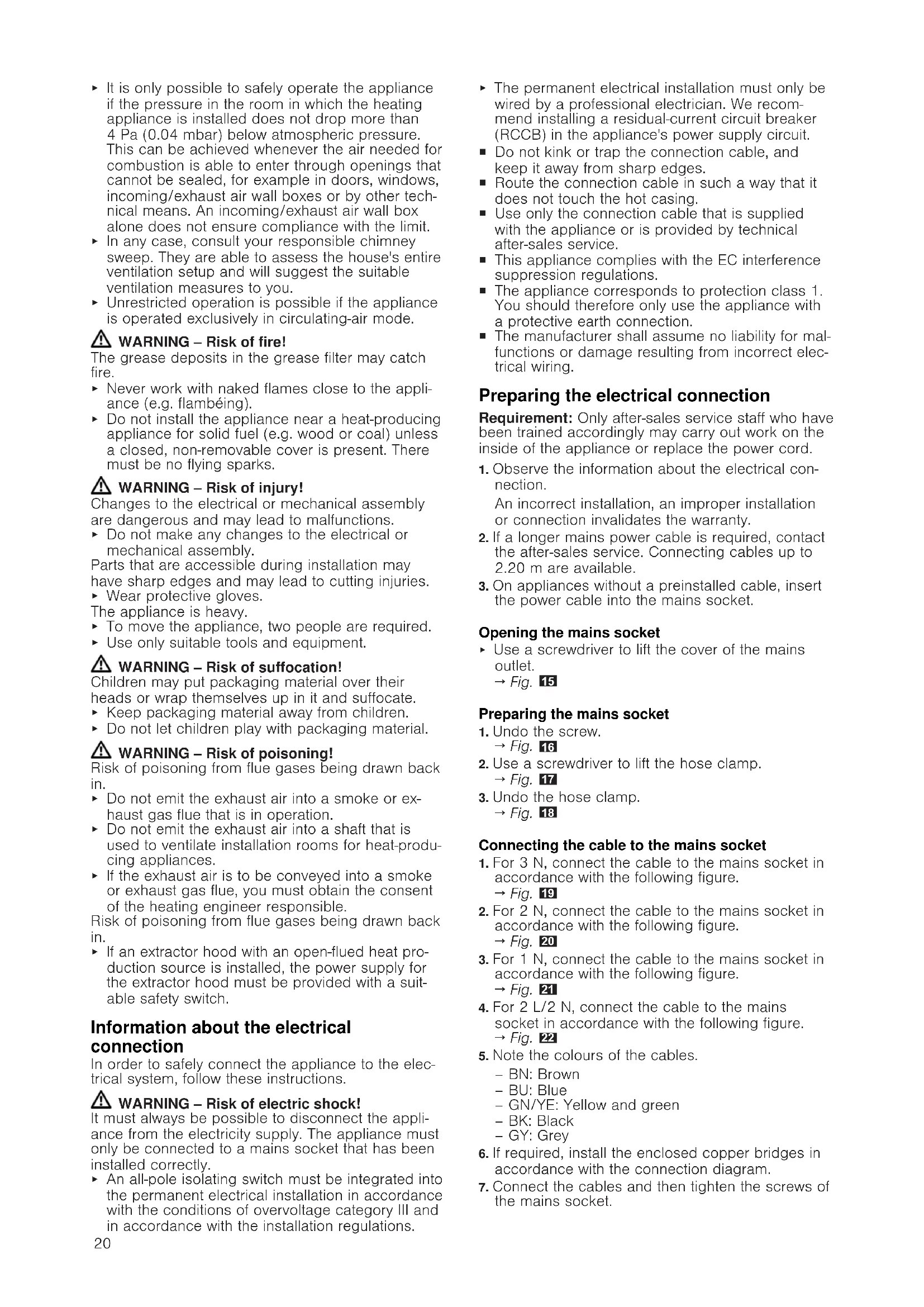 General information ¡ Read this instruction manual carefully. ¡ Only a licensed expert may connect the appliance. ¡ Switch off the power supply before carry- ing out any work. ¡ Never use this appliance in boats or in vehicles. ¡ Follow the worktop manufacturer's recom- mendations. Safe installation Follow these safety instructions when installing the appliance. The appliance can only be used safely if it is cor- rectly installed according to the safety instructions. The installer is responsible for ensuring that the ap- pliance works perfectly at its installation location. WARNING‒Danger: Magnetism! The appliance contains permanent magnets. They may affect electronic implants, e.g. pacemakers or insulin pumps. ▶ Persons with electronic implants must stand at least 10cm away from the appliance. WARNING‒Risk of poisoning! Risk of poisoning from flue gases being drawn back in. Room-air-dependent heat-producing appliances (e.g. gas, oil, wood or coal-operated heaters, con- tinuous flow heaters or water heaters) obtain com- bustion air from the room in which they are installed and discharge the exhaust gases into the open through an exhaust gas system (e.g. a chimney). With the extractor hood switched on, air is extracted from the kitchen and the adjacent rooms. Without an adequate supply of air, the air pressure falls below atmospheric pressure. Toxic gases from the flue or the extraction shaft are sucked back into the living space. ▶ Always ensure adequate fresh air in the room if the appliance is being operated in exhaust air mode at the same time as a room-air-dependent heat-producing appliance is being operated.20 ▶ It is only possible to safely operate the appliance if the pressure in the room in which the heating appliance is installed does not drop more than 4Pa(0.04mbar) below atmospheric pressure. This can be achieved whenever the air needed for combustion is able to enter through openings that cannot be sealed, for example in doors, windows, incoming/exhaust air wall boxes or by other tech- nical means. An incoming/exhaust air wall box alone does not ensure compliance with the limit. ▶ In any case, consult your responsible chimney sweep. They are able to assess the house's entire ventilation setup and will suggest the suitable ventilation measures to you. ▶ Unrestricted operation is possible if the appliance is operated exclusively in circulating-air mode. WARNING‒Risk of fire! The grease deposits in the grease filter may catch fire. ▶ Never work with naked flames close to the appli- ance (e.g. flambéing). ▶ Do not install the appliance near a heat-producing appliance for solid fuel (e.g. wood or coal) unless a closed, non-removable cover is present. There must be no flying sparks. WARNING‒Risk of injury! Changes to the electrical or mechanical assembly are dangerous and may lead to malfunctions. ▶ Do not make any changes to the electrical or mechanical assembly. Parts that are accessible during installation may have sharp edges and may lead to cutting injuries. ▶ Wear protective gloves. The appliance is heavy. ▶ To move the appliance, twopeople are required. ▶ Use only suitable tools and equipment. WARNING‒Risk of suffocation! Children may put packaging material over their heads or wrap themselves up in it and suffocate. ▶ Keep packaging material away from children. ▶ Do not let children play with packaging material. WARNING‒Risk of poisoning! Risk of poisoning from flue gases being drawn back in. ▶ Do not emit the exhaust air into a smoke or ex- haust gas flue that is in operation. ▶ Do not emit the exhaust air into a shaft that is used to ventilate installation rooms for heat-produ- cing appliances. ▶ If the exhaust air is to be conveyed into a smoke or exhaust gas flue, you must obtain the consent of the heating engineer responsible. Risk of poisoning from flue gases being drawn back in. ▶ If an extractor hood with an open-flued heat pro- duction source is installed, the power supply for the extractor hood must be provided with a suit- able safety switch. Information about the electrical connection In order to safely connect the appliance to the elec- trical system, follow these instructions. WARNING‒Risk of electric shock! It must always be possible to disconnect the appli- ance from the electricity supply. The appliance must only be connected to a mains socket that has been installed correctly. ▶ An all-pole isolating switch must be integrated into the permanent electrical installation in accordance with the conditions of overvoltage category III and in accordance with the installation regulations. ▶ The permanent electrical installation must only be wired by a professional electrician. We recom- mend installing a residual-current circuit breaker (RCCB) in the appliance's power supply circuit. ¡ Do not kink or trap the connection cable, and keep it away from sharp edges. ¡ Route the connection cable in such a way that it does not touch the hot casing. ¡ Use only the connection cable that is supplied with the appliance or is provided by technical after-sales service. ¡ This appliance complies with the EC interference suppression regulations. ¡ The appliance corresponds to protection class 1. You should therefore only use the appliance with a protective earth connection. ¡ The manufacturer shall assume no liability for mal- functions or damage resulting from incorrect elec- trical wiring. Preparing the electrical connection Requirement:Only after-sales service staff who have been trained accordingly may carry out work on the inside of the appliance or replace the power cord.