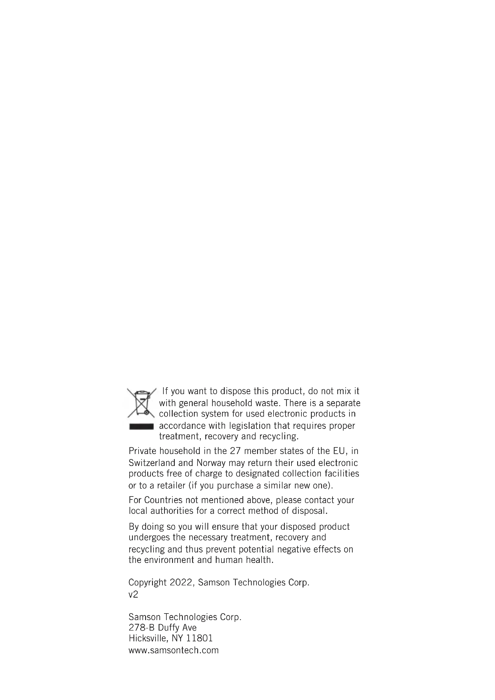 Studio Condenser Microphone Owner's ManualIf you want to dispose this product, do not mix it with general household waste. There is a separate collection system for used electronic products in accordance with legislation that requires proper treatment, recovery and recycling. Private household in the 27 member states of the EU, in Switzerland and Norway may return their used electronic products free of charge to designated collection facilities or to a retailer (if you purchase a similar new one). For Countries not mentioned above, please contact your local authorities for a correct method of disposal. By doing so you will ensure that your disposed product undergoes the necessary treatment, recovery and recycling and thus prevent potential negative effects on the environment and human health. Copyright 2022, Samson Technologies Corp.