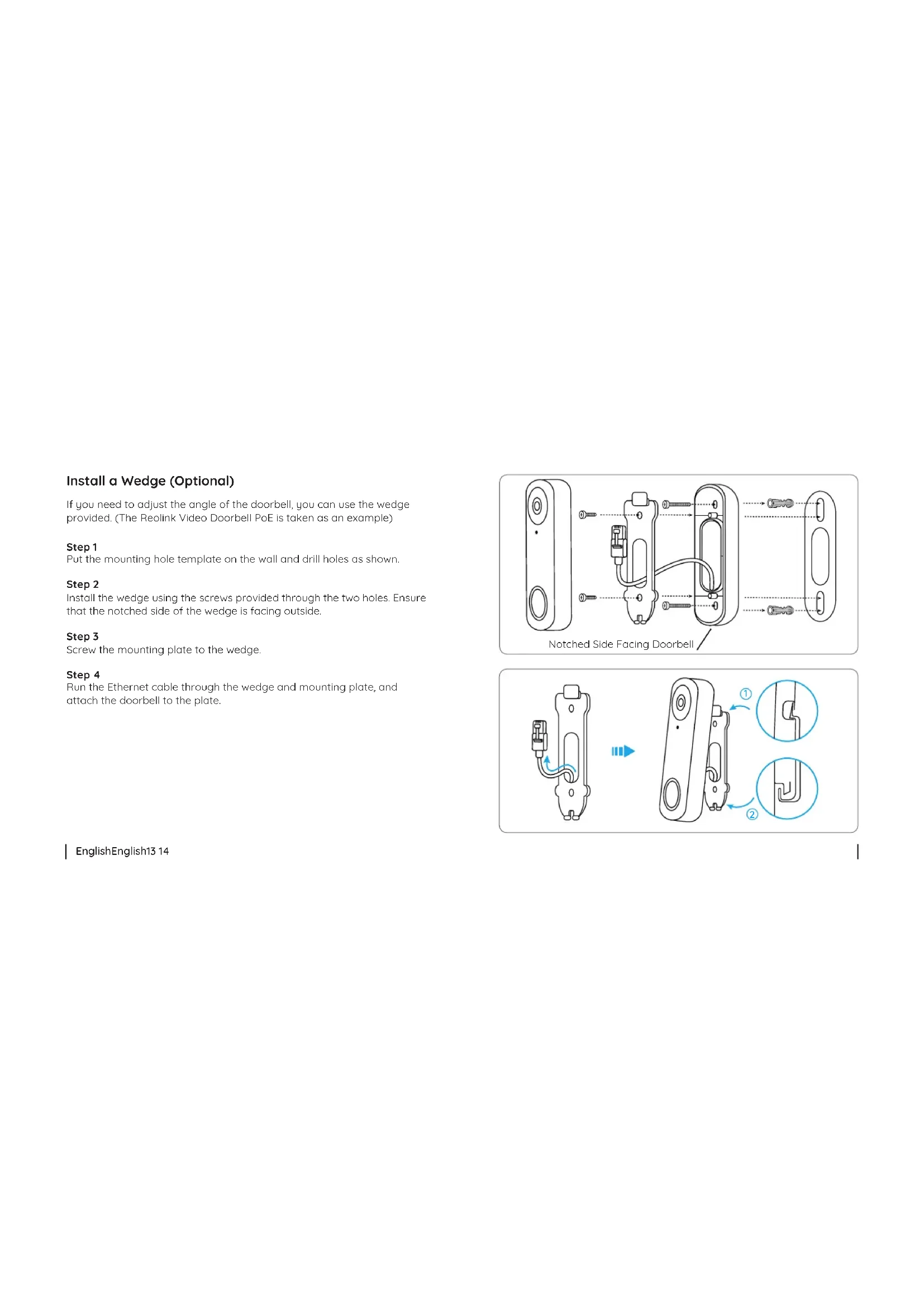 NOTE:ReolinkVideoDoorbellPoE&WiFicanalsobepoweredbythe existingdoorbellwiringsystem.Insuchcase,youarerequiredtofirst bypasstheexistingmechanicalchimewiththejumpercabletoget sufficientpower.Withoutsufficientpower,thedoorbellmayrestartand hasanunstableconnection,andthemechanicalchimemayvibrate and generate noise. Ifthewireisnotlongenough,usetheextensioncable,asshownbelow. Aftertheinstallation,theexistingmechanicalchimewillnotringanymore. Usetheextensioncabletoextendthelengthoftheexistingpowercable forthedoorbell,asshownbelow. Mechanical ChimeDoorbell Transformer Ground Jumper cable Extension cable NeutralAC Rear FrontTransEnglish English13 14 Install a Wedge (Optional) Ifyouneedtoadjusttheangleofthedoorbell,youcanusethewedge provided. (The Reolink Video Doorbell PoE is taken as an example) Step 1 Put the mounting hole template on the wall and drill holes as shown. Step 2 Install the wedge using the screws provided through the two holes. Ensure thatthenotchedsideofthewedgeisfacingoutside. Step 3 Screw the mounting plate to the wedge. Step 4 RuntheEthernetcablethroughthewedgeandmountingplate,and attach the doorbell to the plate. POE Micro SD RST LAN Micro SD RST Devices Cloud You haven't added any device. Please click the"+"button in the top right corner to add