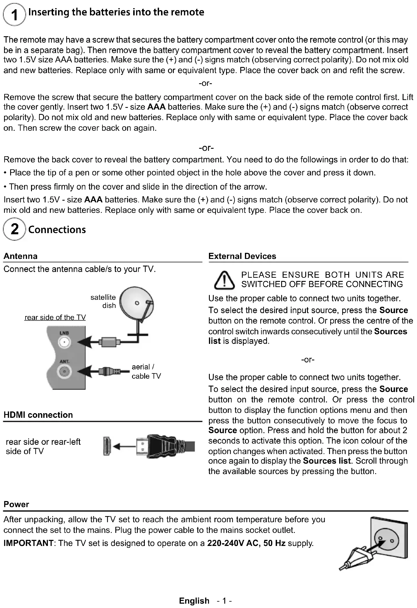 button to display the function options menu and then press the button consecutively to move the focus to Source option. Press and hold the button for about 2 seconds to activate this option. The icon colour of the option changes when activated. Then press the button once again to display the Sources list the available sources by pressing the button. Power After unpacking, allow the TV set to reach the ambient room temperature before you connect the set to the mains. Plug the power cable to the mains socket outlet. IMPORTANT: The TV set is designed to operate on a 220-240V AC, 50 Hz supply.English - 2 - Switching on the TV
