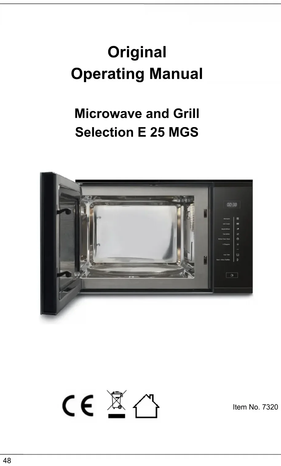 The following table assists in localizing and rectifying minor faults. Error Possible cause Action The selected program will not start. Device door is not closed Close device door Power plug is not plugged in Plug in mains plug! Fuse is not activated Activate fuse The turntable turns jerkily. Dirt between the turntable and the base of cooking camber Remove dirt Dirt on rolling ring Cooking vessel too large Use different cooking vessel Food is not sufficiently defrosted, warmed up or cooked after preset time has elapsed. Incorrectly selected time or power level Re-set time and power level Repeat process The device functions but the cooking chamber lighting does not work. Defective cooking chamber light. Have Service dept repair cooking chamber light. Abnormal noises can be heard during operation of microwave. Food is covered with aluminium foil Remove aluminium foil The cookware contains metal and sparks are being created within the cooking chamber Observe information on cookware! The time in the display field is not correct. Power failure Re-set time Please note ► If you are unable to solve the problem with the steps shown above, please contact Customer Service.78 18 Disposal of the Old Device Old electric and electronic devices frequently still contain valuable materials. However, they also contain damaging substances, which were necessary for their functionality and safety. If these were put in the non-recyclable waste or were handled incorrectly, they could be detrimental to human health and the environment. Therefore, do not put your old device into the non-recyclable waste under any circumstances. Please note ► Utilise the collection point, established in your town, to return and recycle old electric and electronic devices. If necessary, contact your town hall, local refuse collection service or your dealer for information. ► Ensure that your old device is stored safely away from children until it is taken away. 19 Guarantee We provide a 24 month guarantee for this product, commencing from the date of sale, for faults which are attributable to production or material faults. Your legal guarantee entitlements in accordance with § 439 ff. BGB-E remain unaffected by this. The guarantee does not include damages, which were incurred as a result of improper handling or use, as well as malfunctions which only have a minor effect on the function or the value of the device. Consumables, transit damages, inasmuch as we are not responsible for these, as well as damages, which were incurred as a result of any repairs that were not performed by us, are also excluded from the guarantee entitlements. This device is designed for use in domestic situations and has the appropriate performance levels. Any use in commercial situations is only covered under the guarantee to the extent that it would be comparable with the stresses of being used in a domestic situation. It is not intended for any additional, commercial use. In the event of justified complaints, we will repair the faulty device at our discretion or replace it with a trouble-free device. Any pending faults must be reported within 14 days of delivery. All further claims are excluded. To enforce a guarantee claim, please contact us prior to returning the device (always provide us with proof of purchase).79 20 Technical Data Device Microwave and Grill Name Selection E 25 MGS Item No.: 7320 Mains data 230V~ 50Hz Power consumption 1450W (Microwave) 1000W (Grill) < 1W (Standby) Nominal output of microwave 900W Operating frequency 2450MHz External measurements (W x H x D): 598 x 387 x 392 mm Cooking chamber dimensions (W x H x D): 330 x 218 x 337 mm Capacity ca. 25 L Net weight 16,20 kg80 Mode d'emploi original Micro-onde et grill Selection E 25 MGS N°. d'art. 732081 21 Mode d´emploi