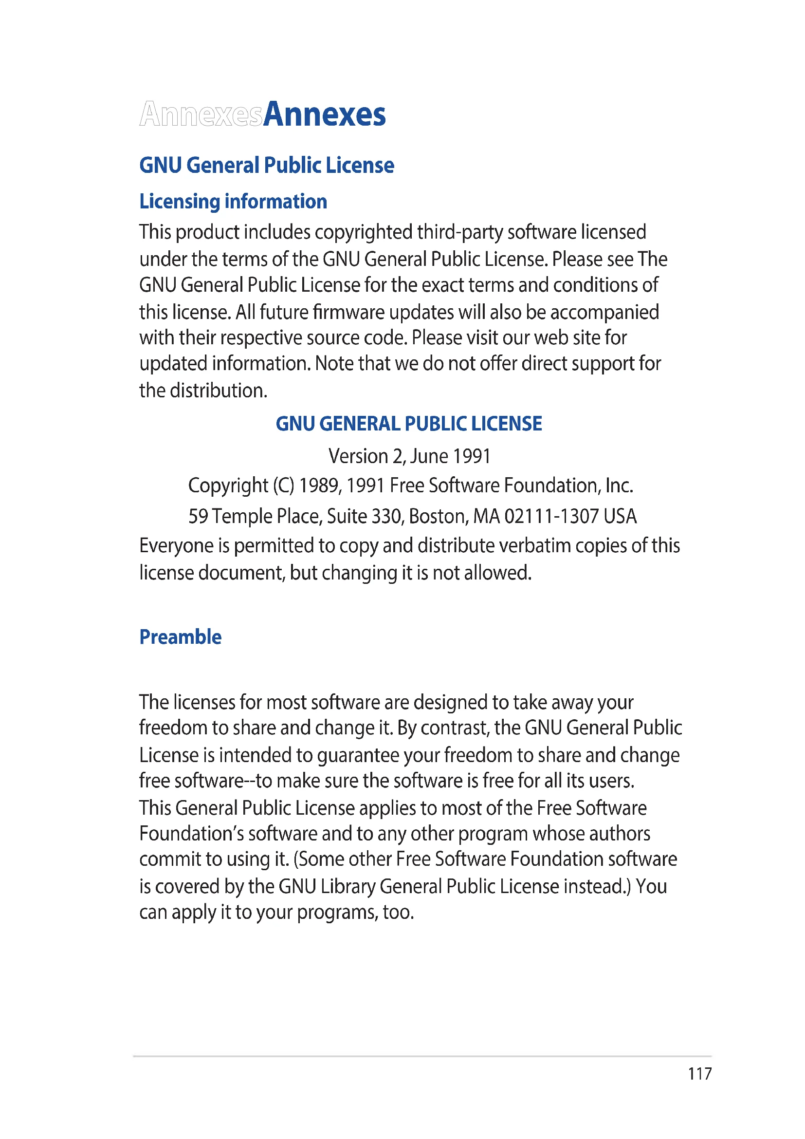 Version 2, June 1991 Copyright (C) 1989, 1991 Free Software Foundation, Inc. 59 Temple Place, Suite 330, Boston, MA 02111-1307 USA Everyone is permitted to copy and distribute verbatim copies of this license document, but changing it is not allowed. Preamble The licenses for most software are designed to take away your freedom to share and change it. By contrast, the GNU General Public License is intended to guarantee your freedom to share and change free software--to make sure the software is free for all its users. This General Public License applies to most of the Free Software Foundation’s software and to any other program whose authors commit to using it. (Some other Free Software Foundation software is covered by the GNU Library General Public License instead.) You can apply it to your programs, too. AnnexesAnnexes118 When we speak of free software, we are referring to freedom, not price. Our General Public Licenses are designed to make sure that you have the freedom to distribute copies of free software (and charge for this service if you wish), that you receive source code or can get it if you want it, that you can change the software or use pieces of it in new free programs; and that you know you can do these things. To protect your rights, we need to make restrictions that forbid anyone to deny you these rights or to ask you to surrender the rights. These restrictions translate to certain responsibilities for you if you distribute copies of the software, or if you modify it. For example, if you distribute copies of such a program, whether gratis or for a fee, you must give the recipients all the rights that you have. You must make sure that they, too, receive or can get the source code. And you must show them these terms so they know their rights. We protect your rights with two steps: (1) copyright the software, and (2) oer you this license which gives you legal permission to copy, distribute and/or modify the software. Also, for each author’s protection and ours, we want to make certain that everyone understands that there is no warranty for this free software. If the software is modied by someone else and passed on, we want its recipients to know that what they have is not the original, so that any problems introduced by others will not reect on the original authors’ reputations.119 Finally, any free program is threatened constantly by software patents. We wish to avoid the danger that redistributors of a free program will individually obtain patent licenses, in eect making the program proprietary. To prevent this, we have made it clear that any patent must be licensed for everyone’s free use or not licensed at all. The precise terms and conditions for copying, distribution and modication follow. Terms & conditions for copying, distribution, & modication