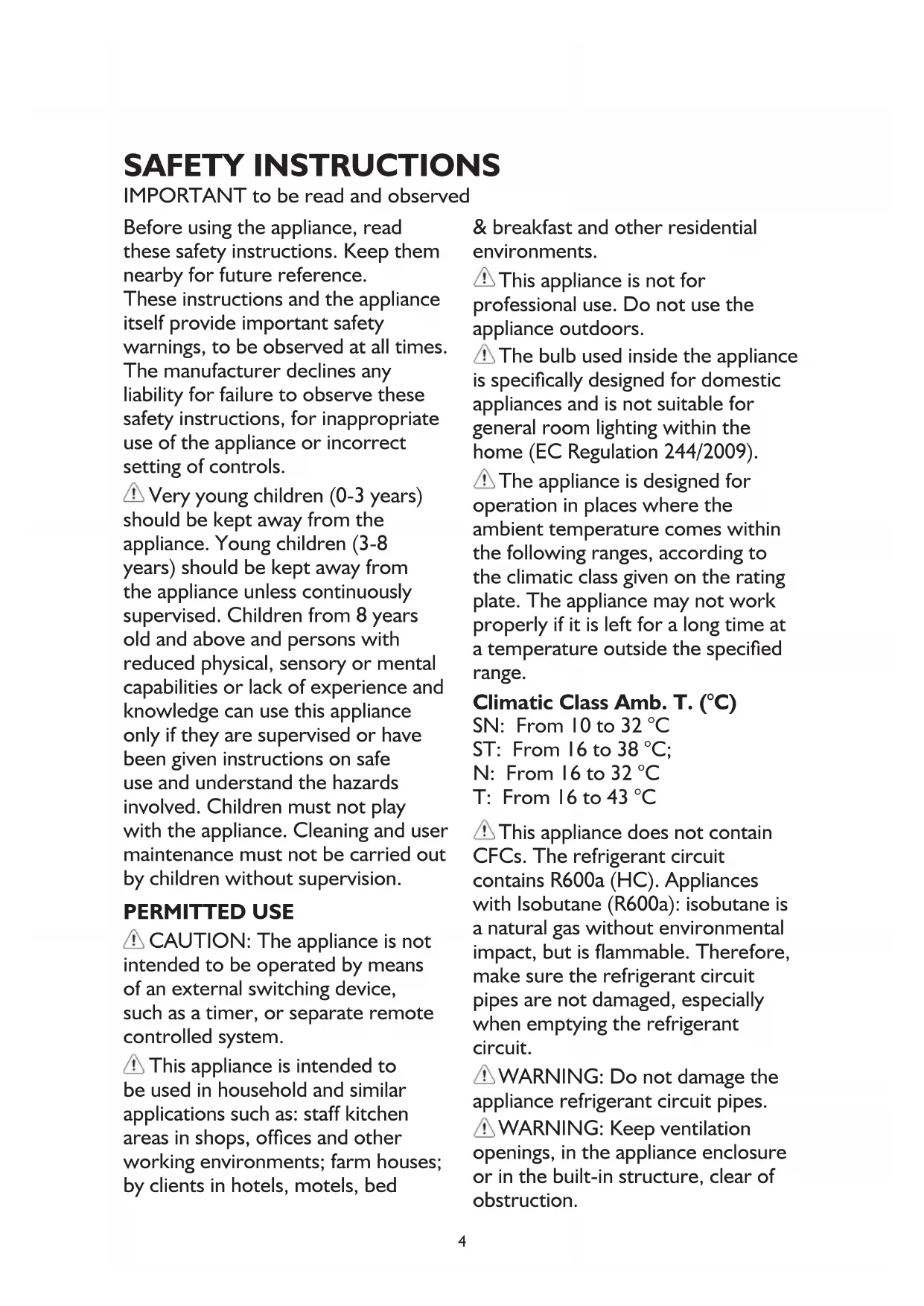 Mode d’emploiENGLISH Instructions for use Page 4 DEUTSCH Gebrauchsanweisung Seite 22 FRANÇAIS Mode d’emploi Page 404 SAFETY INSTRUCTIONS IMPORTANT to be read and observed Before using the appliance, read these safety instructions. Keep them nearby for future reference. These instructions and the appliance itself provide important safety warnings, to be observed at all times. The manufacturer declines any liability for failure to observe these safety instructions, for inappropriate use of the appliance or incorrect setting of controls. Very young children (0-3 years) should be kept away from the appliance. Young children (3-8 years) should be kept away from the appliance unless continuously supervised. Children from 8 years old and above and persons with reduced physical, sensory or mental capabilities or lack of experience and knowledge can use this appliance only if they are supervised or have been given instructions on safe use and understand the hazards involved. Children must not play with the appliance. Cleaning and user maintenance must not be carried out by children without supervision. PERMITTED USE CAUTION: The appliance is not intended to be operated by means of an external switching device, such as a timer, or separate remote controlled system. This appliance is intended to be used in household and similar applications such as: staff kitchen areas in shops, offices and other working environments; farm houses; by clients in hotels, motels, bed & breakfast and other residential environments. This appliance is not for professional use. Do not use the appliance outdoors. The bulb used inside the appliance is specifically designed for domestic appliances and is not suitable for general room lighting within the home (EC Regulation 244/2009). The appliance is designed for operation in places where the ambient temperature comes within the following ranges, according to the climatic class given on the rating plate. The appliance may not work properly if it is left for a long time at a temperature outside the specified range. Climatic Class Amb. T. (°C) SN: From 10 to 32 °C ST: From 16 to 38 °C; N: From 16 to 32 °C T: From 16 to 43 °C This appliance does not contain CFCs. The refrigerant circuit contains R600a (HC). Appliances with Isobutane (R600a): isobutane is a natural gas without environmental impact, but is flammable. Therefore, make sure the refrigerant circuit pipes are not damaged, especially when emptying the refrigerant circuit.