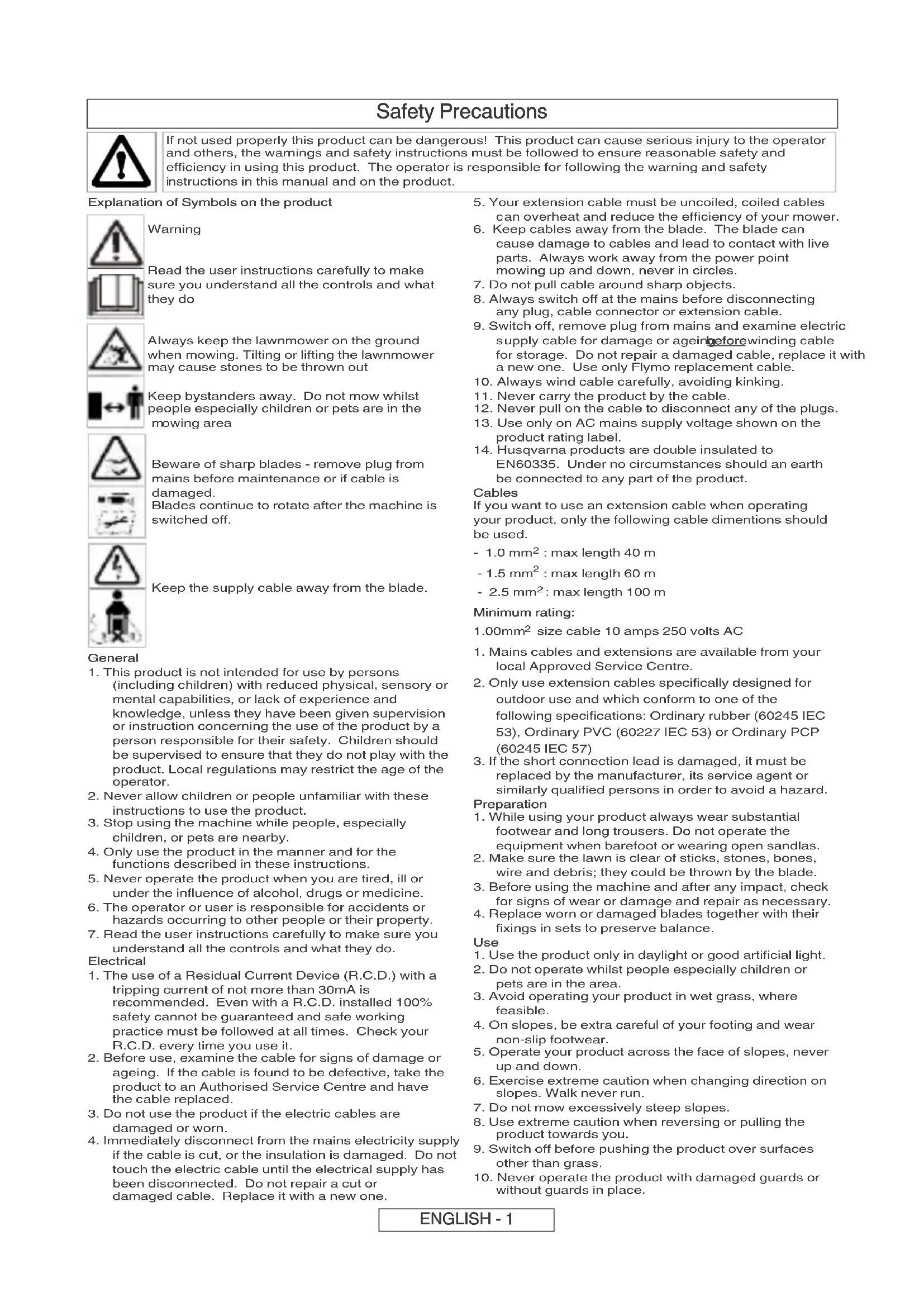 owing area Beware of sharp blades - remove plug from mains before maintenance or if cable is damaged. Blades continue to rotate after the machine is switched off. Keep the supply cable away from the blade. General