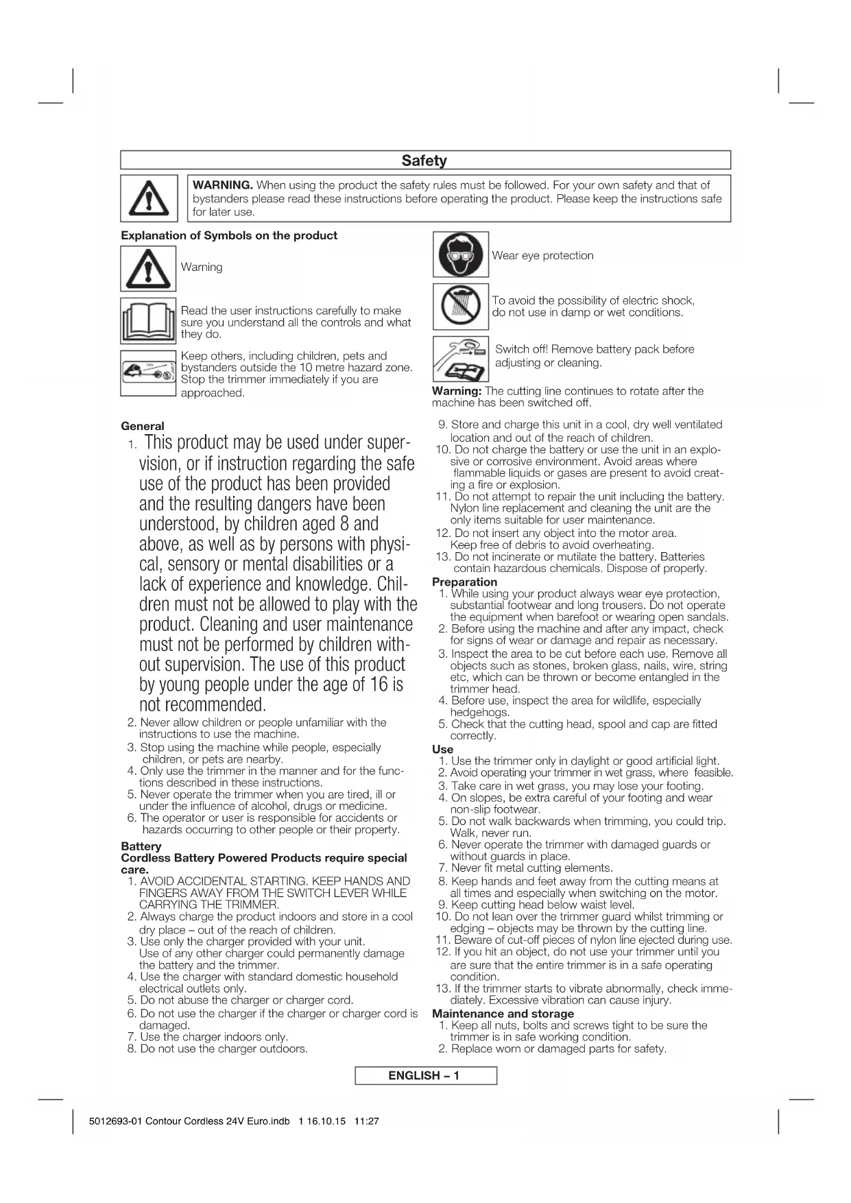 5012693-01 Contour Cordless 24V Euro.indb 7 16.10.15 11:27ENGLISH – 1 Safety WARNING. When using the product the safety rules must be followed. For your own safety and that of bystanders please read these instructions before operating the product. Please keep the instructions safe for later use. Explanation of Symbols on the product Warning Read the user instructions carefully to make sure you understand all the controls and what they do. Keep others, including children, pets and bystanders outside the 10 metre hazard zone. Stop the trimmer immediately if you are approached. Wear eye protection To avoid the possibility of electric shock, do not use in damp or wet conditions. Switch off! Remove battery pack before adjusting or cleaning.