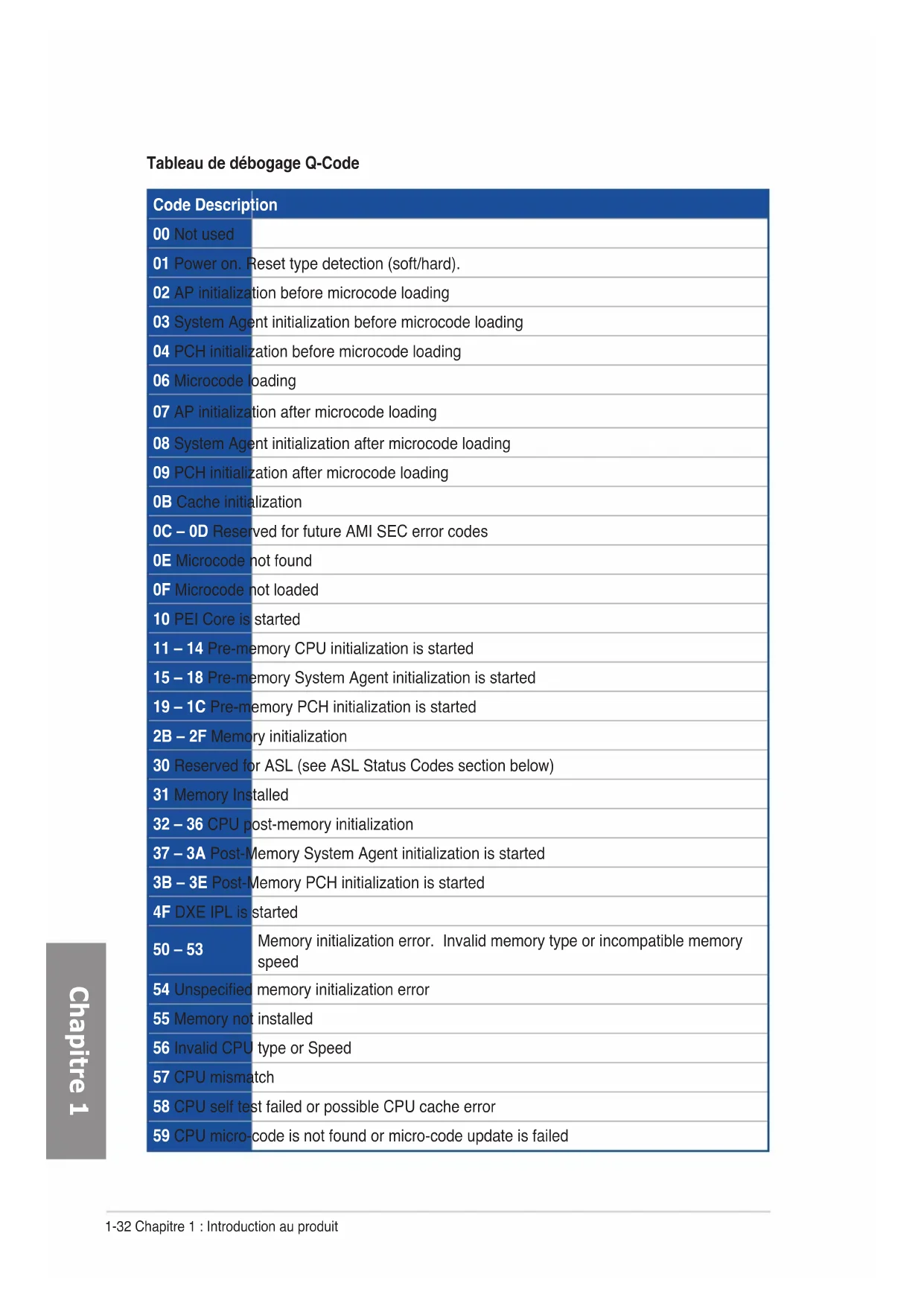 Code Description 10 PEI Core is started 11 – 14 Pre-memory CPU initialization is started 15 – 18 Pre-memory System Agent initialization is started 19 – 1C Pre-memory PCH initialization is started 2B – 2F Memory initialization 30 Reserved for ASL (see ASL Status Codes section below) 31 Memory Installed 32 – 36 CPU post-memory initialization 37 – 3A Post-Memory System Agent initialization is started 3B – 3E Post-Memory PCH initialization is started 4F DXE IPL is started 50 – 53 Memory initialization error. Invalid memory type or incompatible memory speed 54 Unspecied memory initialization error 55 Memory not installed 56 Invalid CPU type or Speed 57 CPU mismatch 58 CPU self test failed or possible CPU cache error 59 CPU micro-code is not found or micro-code update is failed 5A Internal CPU error 5B Reset PPI is not available 5C – 5F Reserved for future AMI error codes E0 S3 Resume is stared (S3 Resume PPI is called by the DXE IPL) E1 S3 Boot Script execution E2 Video repost E3 OS S3 wake vector call E4 – E7 Reserved for future AMI progress codes E8 S3 Resume Failed E9 S3 Resume PPI not Found EA S3 Resume Boot Script Error EB S3 OS Wake Error EC – EF Reserved for future AMI error codes1-34 Chapitre 1 : Introduction au produit