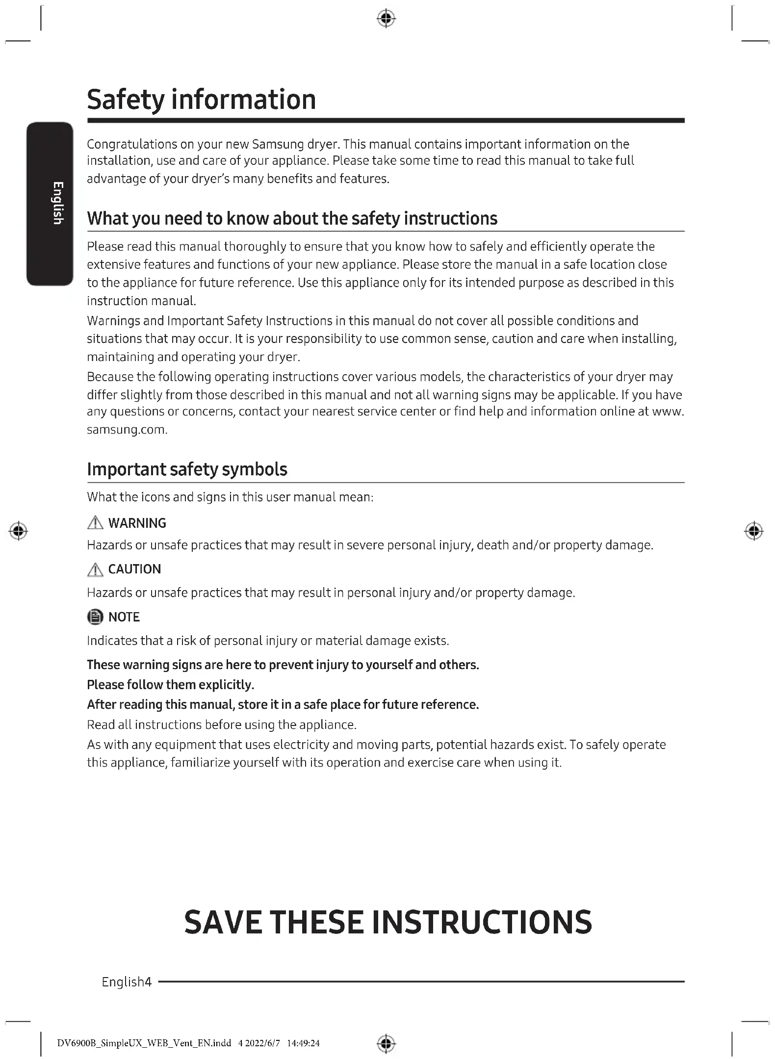 Important safety precautions 9 Warnings 10 Cautions 10 Regulatory notice 12 FCC Notice 12 IC Notice 13 Open Source Announcement 14 Installation requirements 15 Key installation requirements 15 Location considerations 15 Ducting requirements (Not applicable to ventless (heat pump) models) 19 Exhausting requirements (Not applicable to ventless (heat pump) models) 20 Gas requirements (Not applicable to ventless (heat pump) models) 21 Electrical requirements 22 Installation 24 What’s included 24 Step-by-step installation 26 Exhaust ducting guide (Not applicable to ventless (heat pump) models) 30 Changing the direction of the exhaust duct (optional) 31 Vent blockage test 35 Exhaust ducting guide 37 Switching the door position 37 Before you start 42 Initial setup 42 Sort and load 43 Functional prerequisite 43 DV6900B_SimpleUX_WEB_Vent_EN.indd 2 2022/6/7 14:49:24English 3English Operations 44 Control panel 44 Operating a cycle 46 Cycle overview 47 Options 48 Settings 51 Special features 53 Cycle chart 55 Drying guide 57 Maintenance 58 Cleaning 58 Troubleshooting 60 Checkpoints 60 Information codes 62 Specifications 63 Fabric care chart 63 Protecting the environment 64 Specification sheet 64 DV6900B_SimpleUX_WEB_Vent_EN.indd 3 2022/6/7 14:49:24SAVE THESE INSTRUCTIONS English4 English Safety information Congratulations on your new Samsung dryer. This manual contains important information on the installation, use and care of your appliance. Please take some time to read this manual to take full advantage of your dryer’s many benefits and features. What you need to know about the safety instructions Please read this manual thoroughly to ensure that you know how to safely and efficiently operate the extensive features and functions of your new appliance. Please store the manual in a safe location close to the appliance for future reference. Use this appliance only for its intended purpose as described in this instruction manual. Warnings and Important Safety Instructions in this manual do not cover all possible conditions and situations that may occur. It is your responsibility to use common sense, caution and care when installing, maintaining and operating your dryer. Because the following operating instructions cover various models, the characteristics of your dryer may differ slightly from those described in this manual and not all warning signs may be applicable. If you have any questions or concerns, contact your nearest service center or find help and information online at www. samsung.com. Important safety symbols What the icons and signs in this user manual mean: WARNING Hazards or unsafe practices that may result in severe personal injury, death and/or property damage. CAUTION Hazards or unsafe practices that may result in personal injury and/or property damage. NOTE Indicates that a risk of personal injury or material damage exists. These warning signs are here to prevent injury to yourself and others. Please follow them explicitly. After reading this manual, store it in a safe place for future reference. Read all instructions before using the appliance. As with any equipment that uses electricity and moving parts, potential hazards exist. To safely operate this appliance, familiarize yourself with its operation and exercise care when using it. DV6900B_SimpleUX_WEB_Vent_EN.indd 4 2022/6/7 14:49:24English