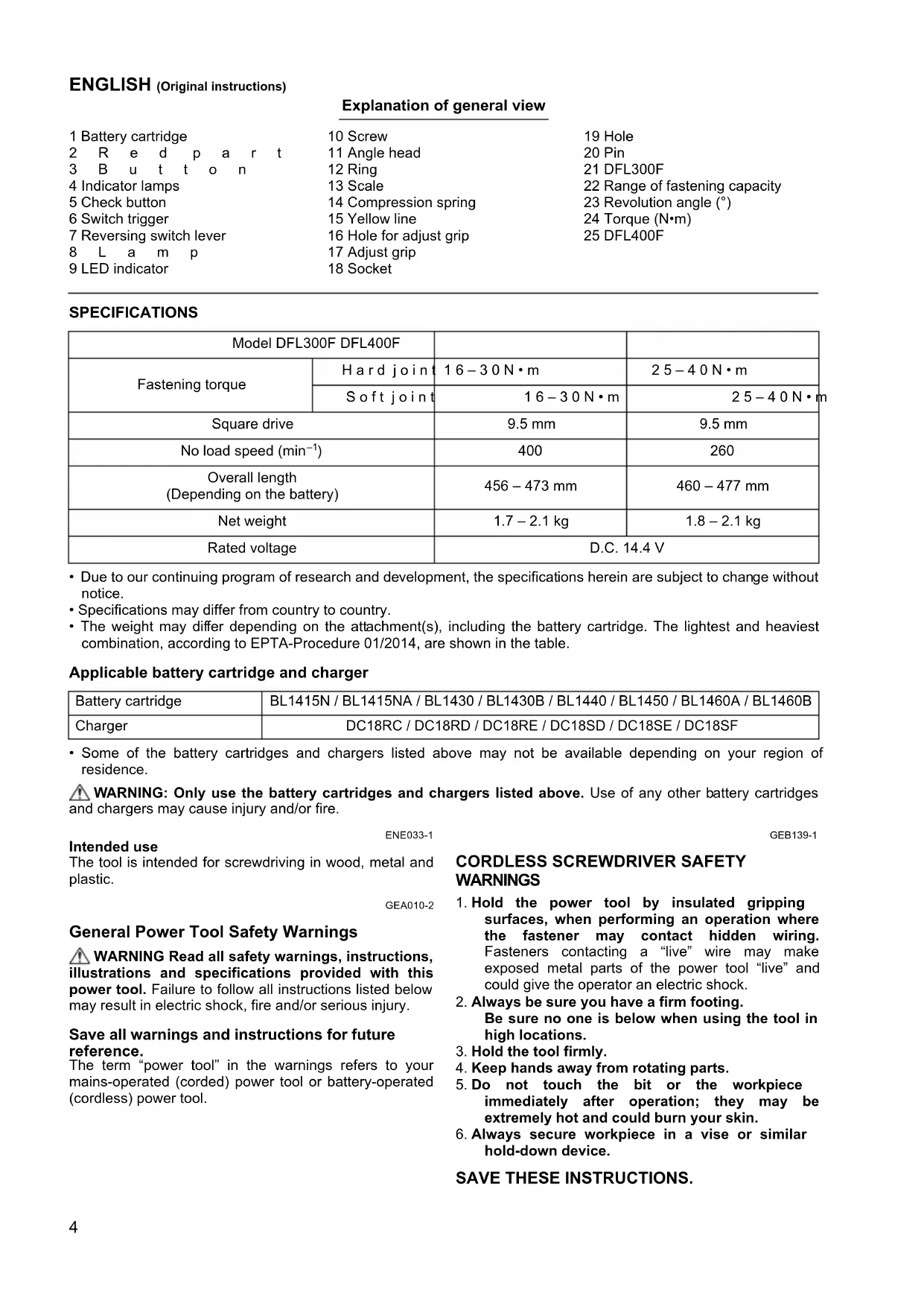 hold-down device. SAVE THESE INSTRUCTIONS. Model DFL300F DFL400F Fastening torque Hard joint 16–30N•m 25–40N•m Soft joint 16–30N•m 25–40N•m Square drive 9.5 mm 9.5 mm No load speed (min