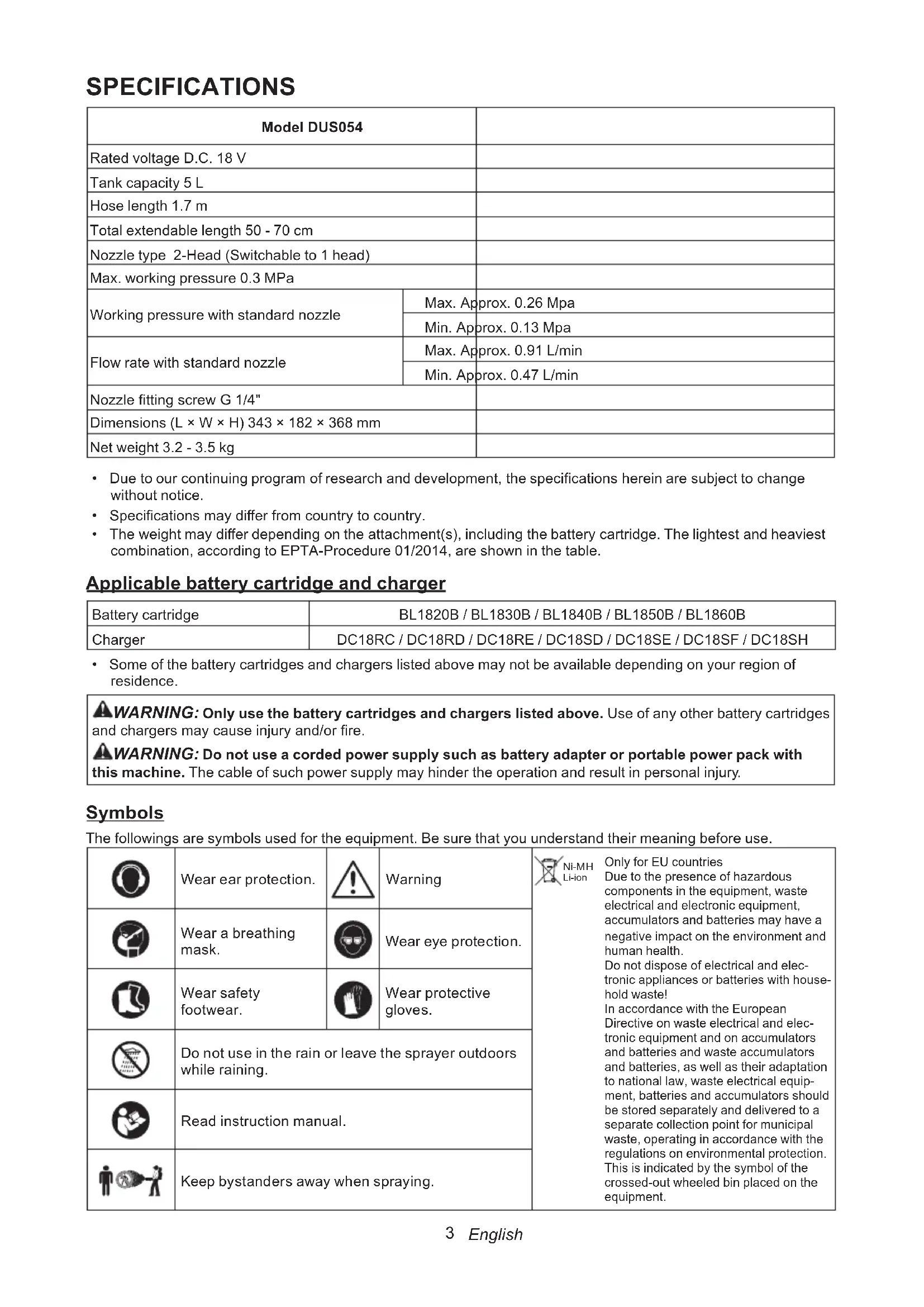 Li-ion Only for EU countries Due to the presence of hazardous components in the equipment, waste electrical and electronic equipment, accumulators and batteries may have a negative impact on the environment and human health. Do not dispose of electrical and elec- tronic appliances or batteries with house- hold waste! In accordance with the European Directive on waste electrical and elec- tronic equipment and on accumulators and batteries and waste accumulators and batteries, as well as their adaptation to national law, waste electrical equip- ment, batteries and accumulators should be stored separately and delivered to a separate collection point for municipal waste, operating in accordance with the regulations on environmental protection. This is indicated by the symbol of the crossed-out wheeled bin placed on the equipment. Wear a breathing mask. Wear eye protection. Wear safety footwear. Wear protective gloves. Do not use in the rain or leave the sprayer outdoors while raining. Read instruction manual. Keep bystanders away when spraying.4 English Intended use This machine is intended for spraying. Noise The typical A-weighted noise level determined accord-ing to EN62841-1:Sound pressure level (L ): 70 dB (A) or less Uncertainty (K): 3 dB (A)NOTE: The declared noise emission value(s) has been measured in accordance with a standard test method and may be used for comparing one tool with another.NOTE: The declared noise emission value(s) may also be used in a preliminary assessment of exposure.WARNING: Wear ear protection.WARNING: The noise emission during actual use of the power tool can dier from the declared value(s) depending on the ways in which the tool is used especially what kind of workpiece is processed.