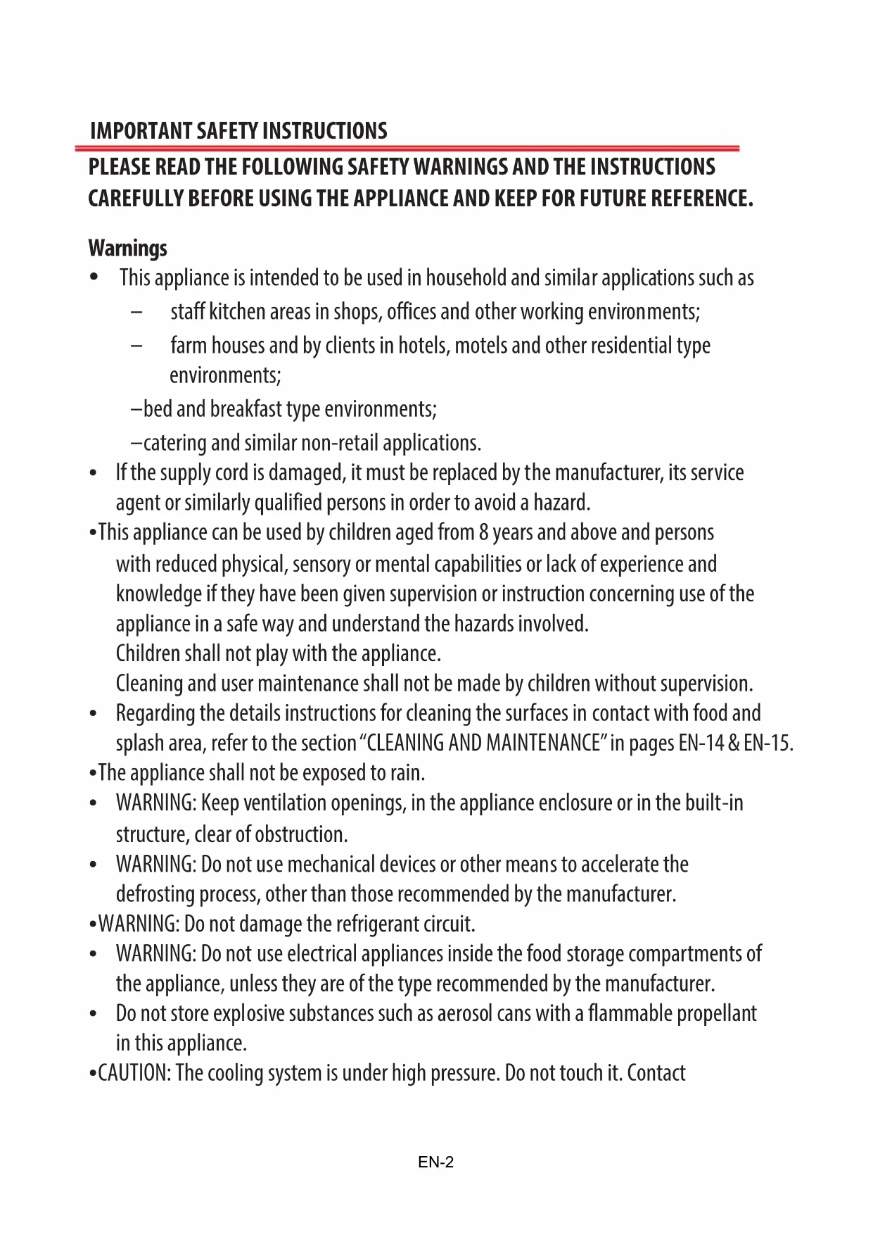 Check the door is aligned horizontally and vertically and that all seals make good contact with the cavity all the way around the cavity opening before finally tightening the hinges. EN-118. Re-fit the top cover by tightening the screws. EN-12DEFROSTING It is recommended that the freezer is defrosted periodically or when the thickness of the frost is more than 3 mm. Do not scrape off hoarfrost or ice with a knife or pointed object. Doing this may damage the refrigerant tubes. 1. Set the temperature control knob to the MIN position and unplug the appliance from the mainssupply. 2. Open the door and remove all the frozen food and wrap in thick blankets or layers of paper to keepthem cold. 3. To accelerate the defrosting process, place a pan of hot water on a stand in the freezer. 4. After defrosting is finished, clean the inside of the appliance. Wipe up condensation with a cloth orsponge. Wipe dry the compartment. 5. Plug the appliance back to the mains socket. 6. Place the food back into the freezer and set the temperature to the desired setting.