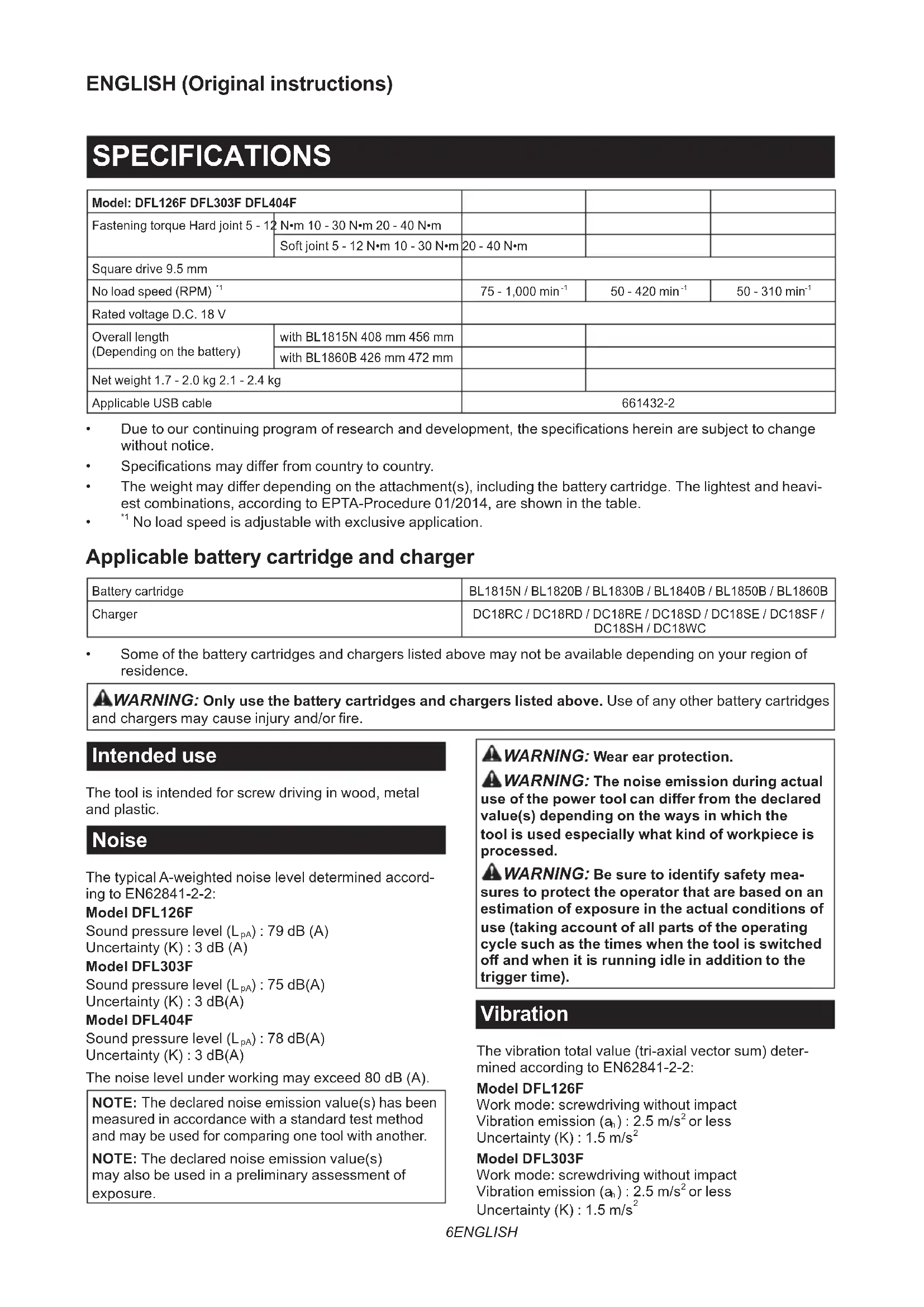 or less Uncertainty (K) : 1.5 m/s 27 ENGLISH Model DFL404F Work mode: screwdriving without impact Vibration emission (a