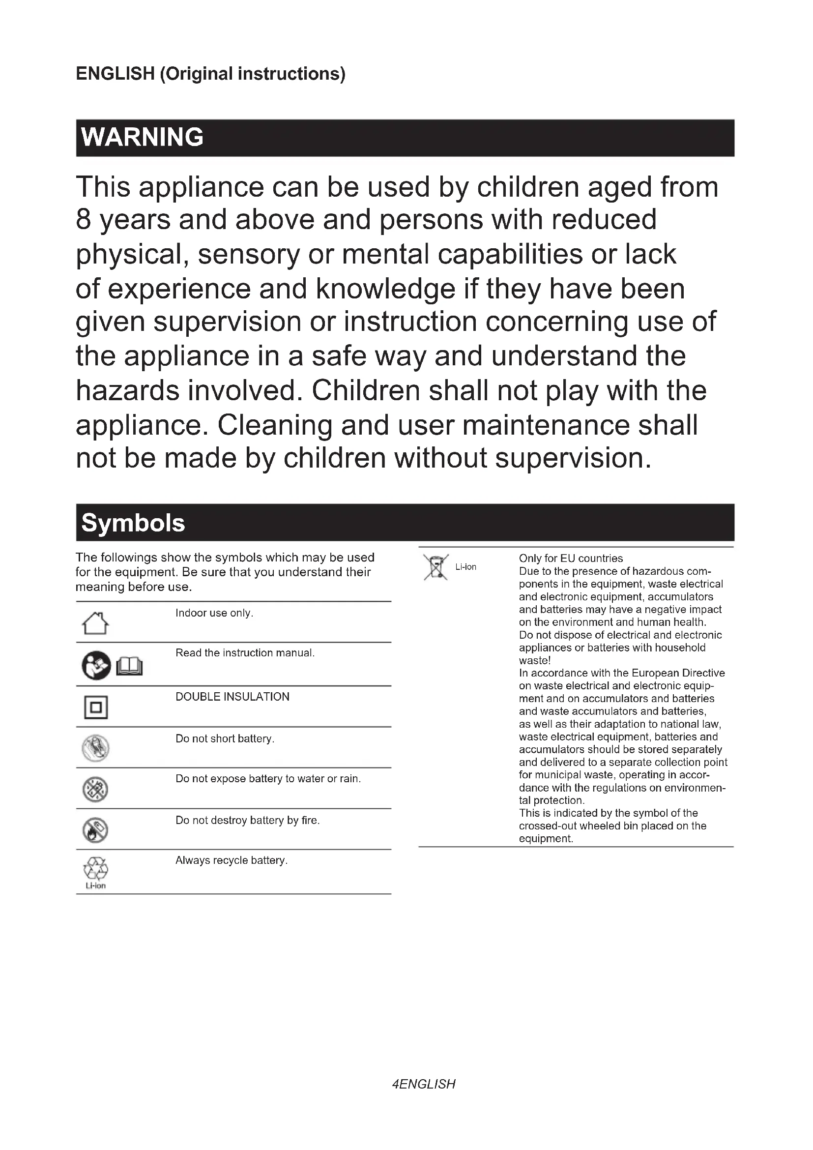 25 mm 4 mm Fig.6 34 ENGLISH ENGLISH (Original instructions) WARNING This appliance can be used by children aged from 8 years and above and persons with reduced physical, sensory or mental capabilities or lack of experience and knowledge if they have been given supervision or instruction concerning use of the appliance in a safe way and understand the hazards involved. Children shall not play with the appliance. Cleaning and user maintenance shall not be made by children without supervision. Symbols The followings show the symbols which may be used for the equipment. Be sure that you understand their meaning before use. Indoor use only. Read the instruction manual. DOUBLE INSULATION Do not short battery. Do not expose battery to water or rain. Do not destroy battery by re. Always recycle battery. Li-ion Only for EU countries Due to the presence of hazardous com- ponents in the equipment, waste electrical and electronic equipment, accumulators and batteries may have a negative impact on the environment and human health. Do not dispose of electrical and electronic appliances or batteries with household waste! In accordance with the European Directive on waste electrical and electronic equip- ment and on accumulators and batteries and waste accumulators and batteries, as well as their adaptation to national law, waste electrical equipment, batteries and accumulators should be stored separately and delivered to a separate collection point for municipal waste, operating in accor- dance with the regulations on environmen- tal protection. This is indicated by the symbol of the crossed-out wheeled bin placed on the equipment.5 ENGLISH ► Fig.1 Ready to charge. Delay charge (Battery cooling, too cold battery, or waiting for charging). Charging (0 - 80 %). Charging (80 - 100 %). Charging complete. Charging (Cooling abnormality). Defective battery. CAUTION