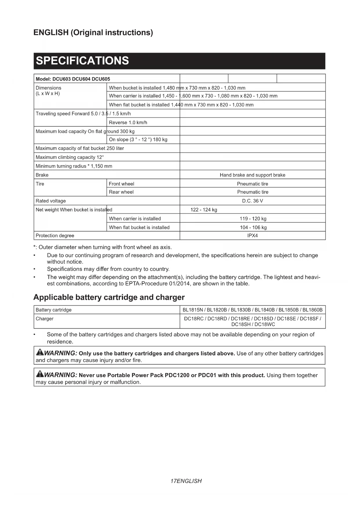 Fig.7117 ENGLISH ENGLISH (Original instructions) SPECIFICATIONS Model: DCU603 DCU604 DCU605 Dimensions (L x W x H) When bucket is installed 1,480 mm x 730 mm x 820 - 1,030 mm When carrier is installed 1,450 - 1,600 mm x 730 - 1,080 mm x 820 - 1,030 mm When at bucket is installed 1,440 mm x 730 mm x 820 - 1,030 mm Traveling speed Forward 5.0 / 3.5 / 1.5 km/h Reverse 1.0 km/h Maximum load capacity On at ground 300 kg On slope (3 ° - 12 °) 180 kg Maximum capacity of at bucket 250 liter Maximum climbing capacity 12° Minimum turning radius * 1,150 mm Brake Hand brake and support brake Tire Front wheel Pneumatic tire Rear wheel Pneumatic tire Rated voltage D.C. 36 V Net weight When bucket is installed 122 - 124 kg When carrier is installed 119 - 120 kg When at bucket is installed 104 - 106 kg Protection degree IPX4 *: Outer diameter when turning with front wheel as axis.
