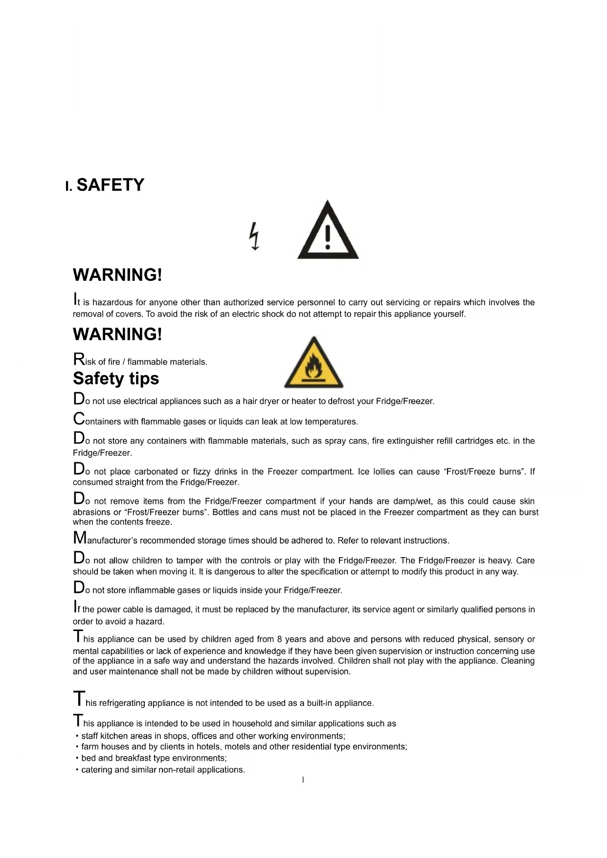 o not use electrical appliances such as a hair dryer or heater to defrost your Fridge/Freezer. Containers with flammable gases or liquids can leak at low temperatures. Do not store any containers with flammable materials, such as spray cans, fire extinguisher refill cartridges etc. in the Fridge/Freezer. Do not place carbonated or fizzy drinks in the Freezer compartment. Ice lollies can cause “Frost/Freeze burns”. If consumed straight from the Fridge/Freezer. Do not remove items from the Fridge/Freezer compartment if your hands are damp/wet, as this could cause skin abrasions or “Frost/Freezer burns”. Bottles and cans must not be placed in the Freezer compartment as they can burst when the contents freeze. Manufacturer’s recommended storage times should be adhered to. Refer to relevant instructions. Do not allow children to tamper with the controls or play with the Fridge/Freezer. The Fridge/Freezer is heavy. Care should be taken when moving it. It is dangerous to alter the specification or attempt to modify this product in any way. Do not store inflammable gases or liquids inside your Fridge/Freezer. If the power cable is damaged, it must be replaced by the manufacturer, its service agent or similarly qualified persons in order to avoid a hazard. This appliance can be used by children aged from 8 years and above and persons with reduced physical, sensory or mental capabilities or lack of experience and knowledge if they have been given supervision or instruction concerning use of the appliance in a safe way and understand the hazards involved. Children shall not play with the appliance. Cleaning and user maintenance shall not be made by children without supervision. This refrigerating appliance is not intended to be used as a built-in appliance. This appliance is intended to be used in household and similar applications such as