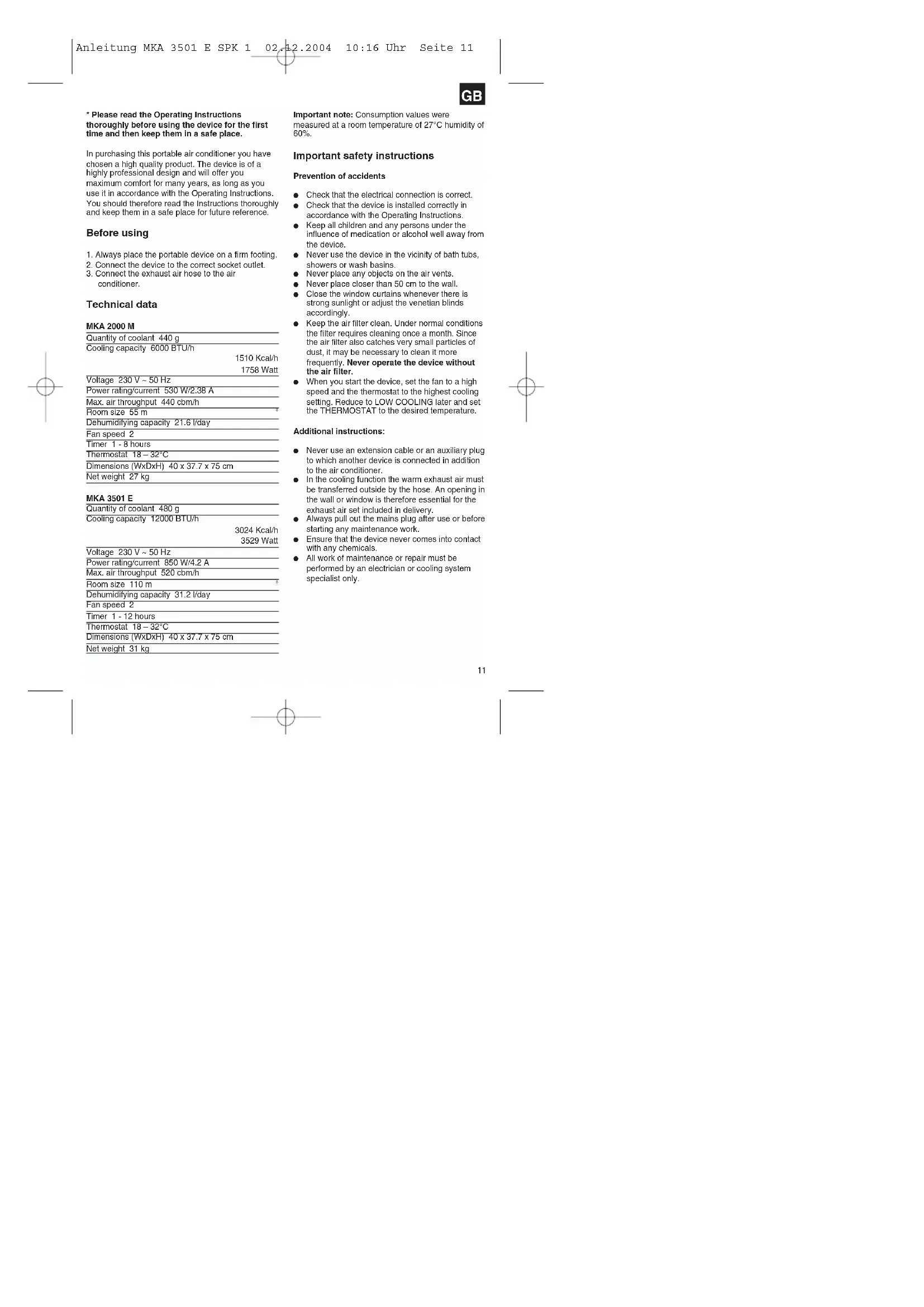 Anleitung MKA 3501 E SPK 1 02.12.2004 10:16 Uhr Seite 10* Please read the Operating Instructions thoroughly before using the device for the first time and then keep them in a safe place. In purchasing this portable air conditioner you have chosen a high quality product. The device is of a highly professional design and will offer you maximum comfort for many years, as long as you use it in accordance with the Operating Instructions. You should therefore read the Instructions thoroughly and keep them in a safe place for future reference. Before using