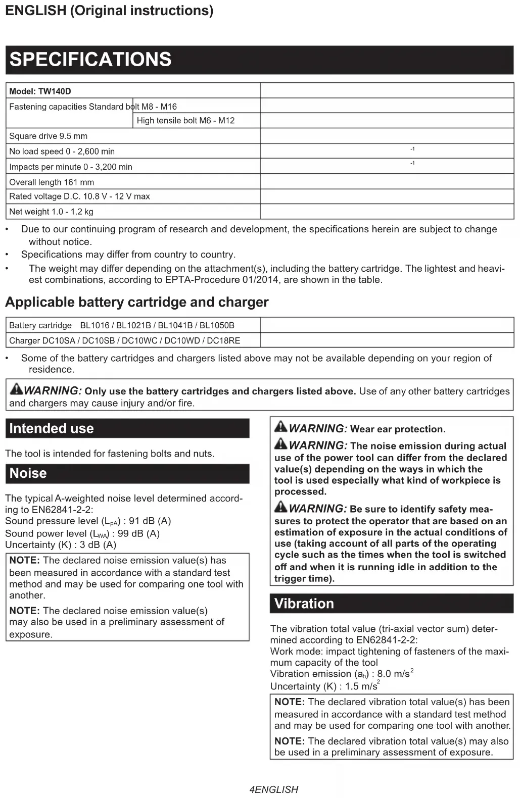 - Theweightmaydierdependingontheattachment(s),includingthebatterycartridge.Thelightestandheavi- est combinations, according to EPTA-Procedure 01/2014, are shown in the table. Applicable battery cartridge and charger Batterycartridge BL1016 / BL1021B / BL1041B / BL1050B Charger DC10SA / DC10SB / DC10WC / DC10WD / DC18RE