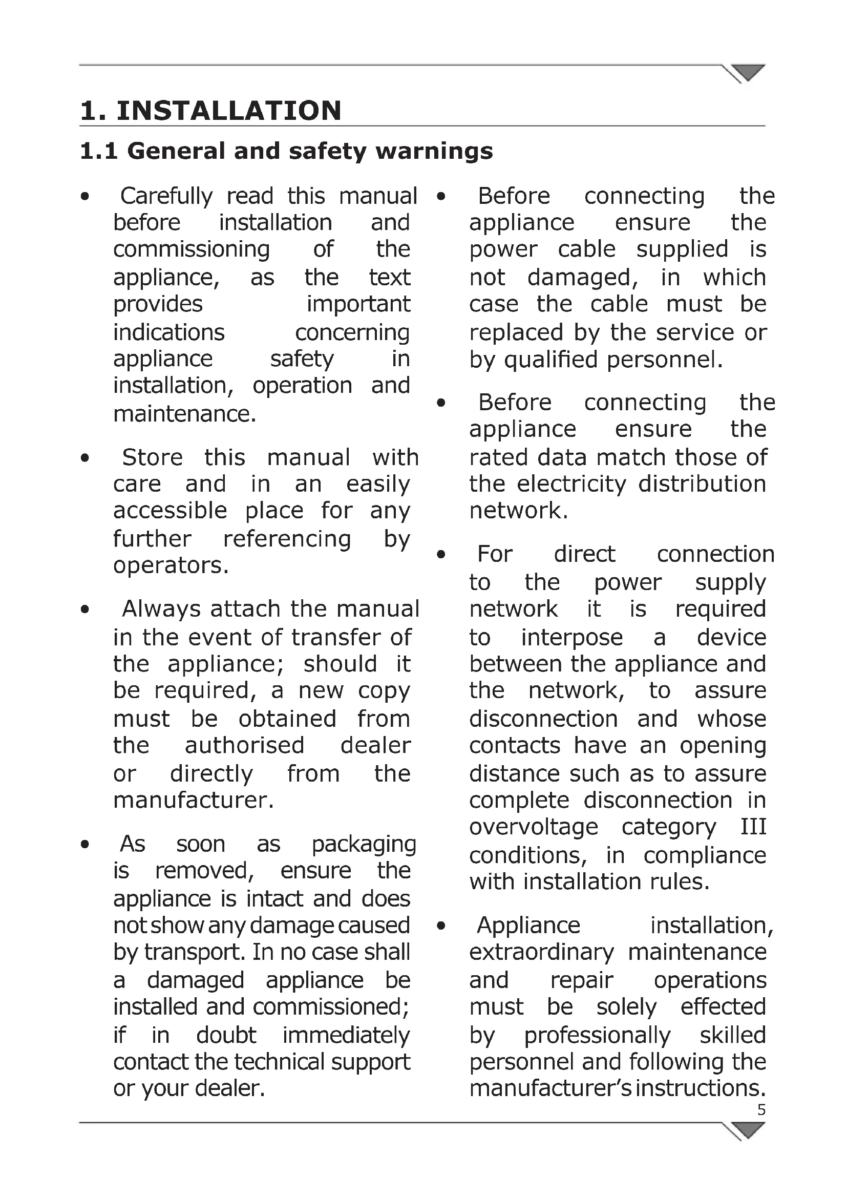 - Appliance installation, extraordinary maintenance and repair operations must be solely effected by professionally skilled personnel and following the manufacturer’s instructions6