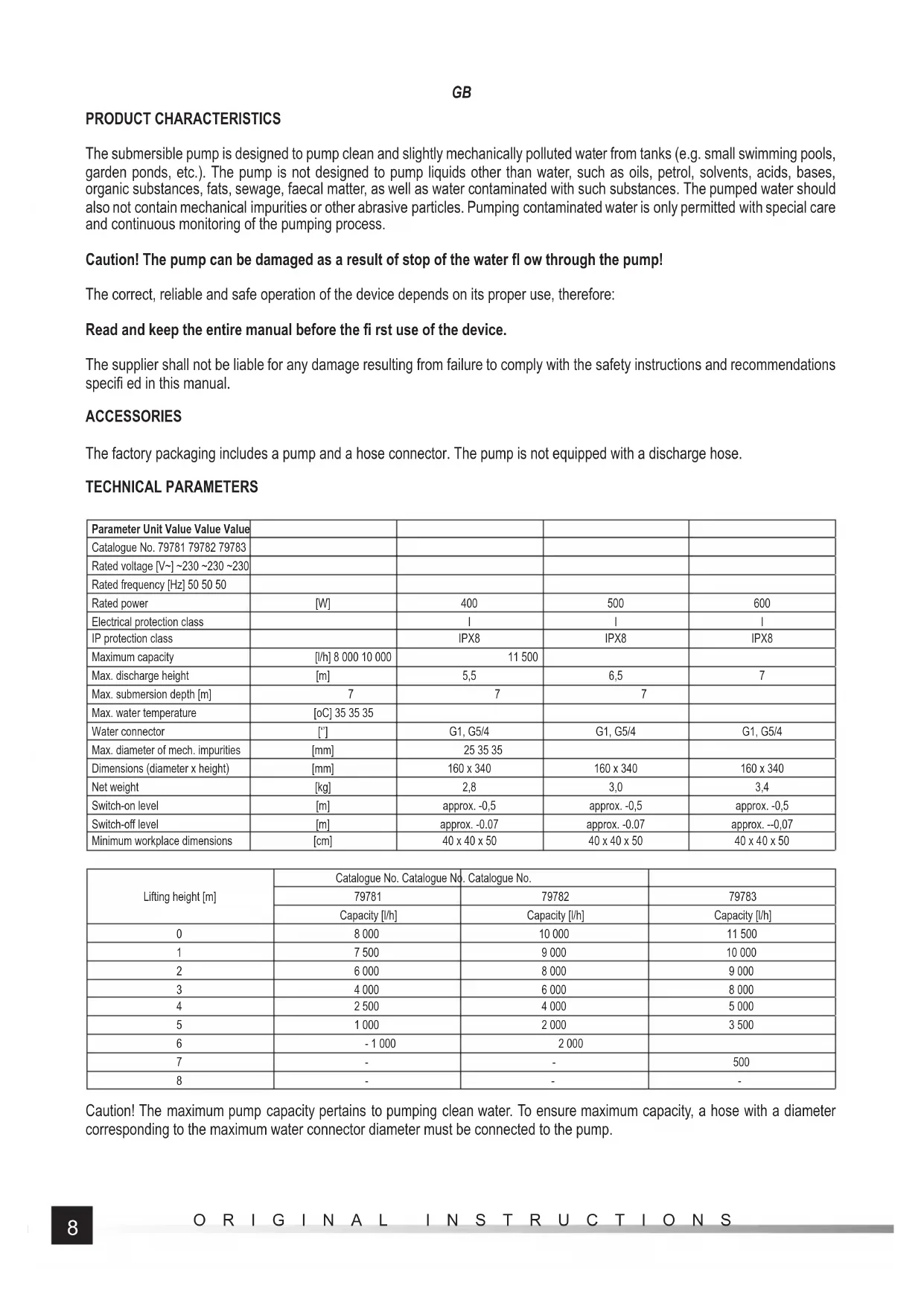 PRODUCT CHARACTERISTICS The submersible pump is designed to pump clean and slightly mechanically polluted water from tanks (e.g. small swimming pools, garden ponds, etc.). The pump is not designed to pump liquids other than water, such as oils, petrol, solvents, acids, bases, organic substances, fats, sewage, faecal matter, as well as water contaminated with such substances. The pumped water should also not contain mechanical impurities or other abrasive particles. Pumping contaminated water is only permitted with special care and continuous monitoring of the pumping process. Caution! The pump can be damaged as a result of stop of the water fl ow through the pump! The correct, reliable and safe operation of the device depends on its proper use, therefore: Read and keep the entire manual before the fi rst use of the device. The supplier shall not be liable for any damage resulting from failure to comply with the safety instructions and recommendations specifi ed in this manual. ACCESSORIES The factory packaging includes a pump and a hose connector. The pump is not equipped with a discharge hose. TECHNICAL PARAMETERS Parameter Unit Value Value Value Catalogue No. 79781 79782 79783 Rated voltage [V~] ~230 ~230 ~230 Rated frequency [Hz] 50 50 50 Rated power [W] 400 500 600 Electrical protection class I I I IP protection class IPX8 IPX8 IPX8 Maximum capacity [l/h] 8 000 10 000 11 500 Max. discharge height [m] 5,5 6,5 7 Max. submersion depth [m] 7 7 7 Max. water temperature [oC] 35 35 35 Water connector [‘’] G1, G5/4 G1, G5/4 G1, G5/4 Max. diameter of mech. impurities [mm] 25 35 35 Dimensions (diameter x height) [mm] 160 x 340 160 x 340 160 x 340 Net weight [kg] 2,8 3,0 3,4 Switch-on level [m] approx. -0,5 approx. -0,5 approx. -0,5 Switch-off level [m] approx. -0.07 approx. -0.07 approx. --0,07 Minimum workplace dimensions [cm] 40 x 40 x 50 40 x 40 x 50 40 x 40 x 50 Lifting height [m] Catalogue No. Catalogue No. Catalogue No.