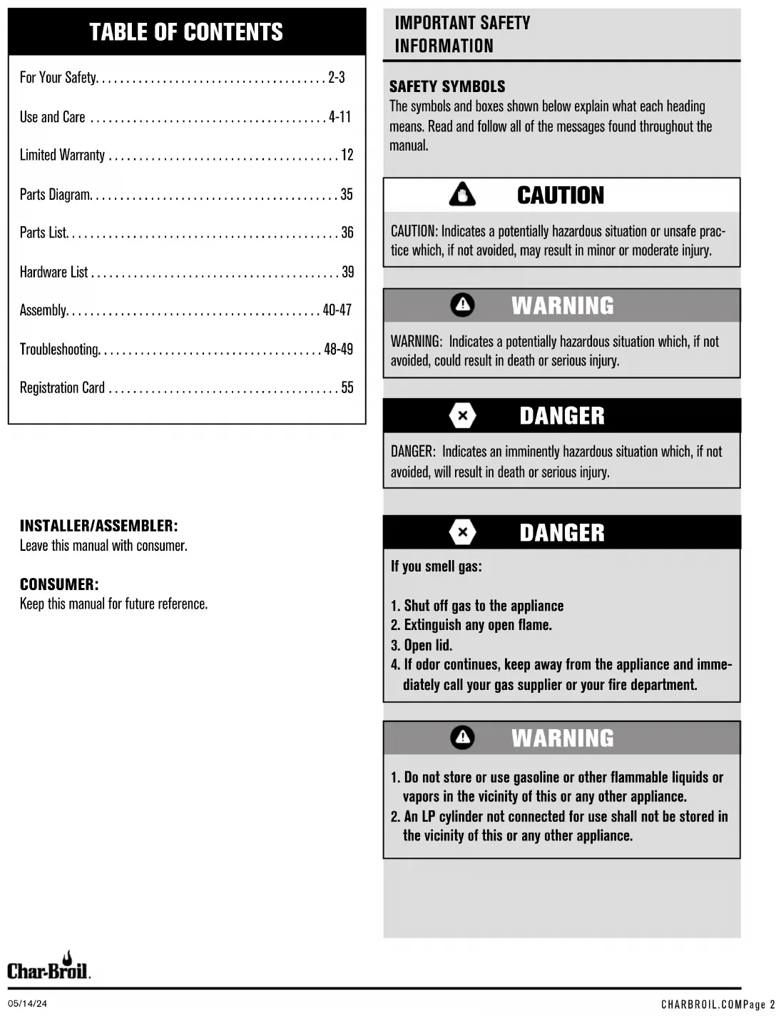 - -49 Registration Card 05/14/24CHARBROIL.COMPage 3 FOR YOUR SAFETY - INSTALLING YOUR GRILL CAUTION DANGER For residential use only. Do not use for commercial cooking. Read and follow all safety statements, assembly instructions, and use and care directions before attempting to assemble and cook. Some parts may contain sharp edges. Wear protective gloves if necessary. Grease Fires p. 55