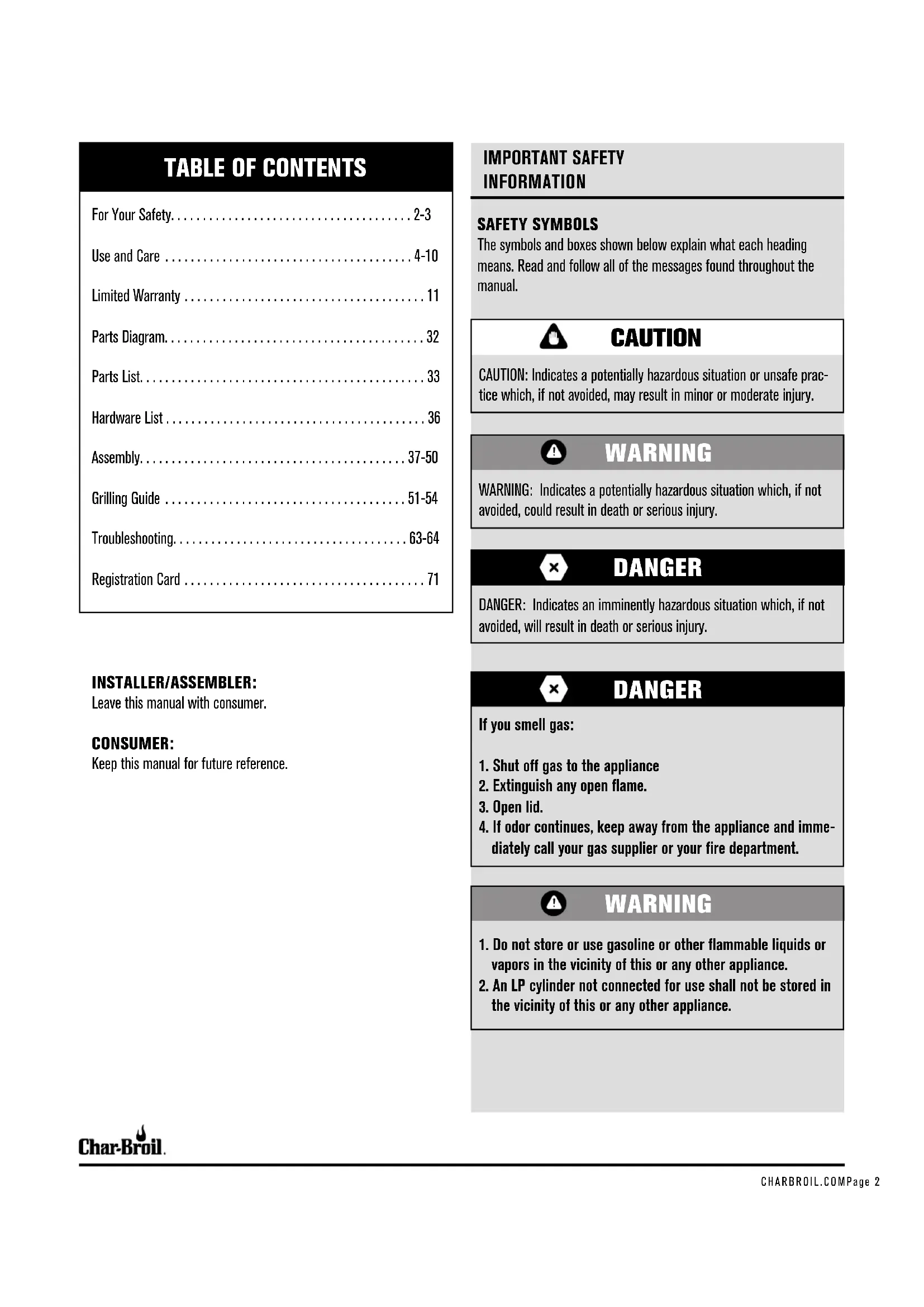 - -64 Registration Card CHARBROIL.COMPage 3 FOR YOUR SAFETY - INSTALLING YOUR GRILL CAUTION DANGER For residential use only. Do not use for commercial cooking. Read and follow all safety statements, assembly instructions, and use and care directions before attempting to assemble and cook. Some parts may contain sharp edges. Wear protective gloves if necessary. Grease Fires p. 71