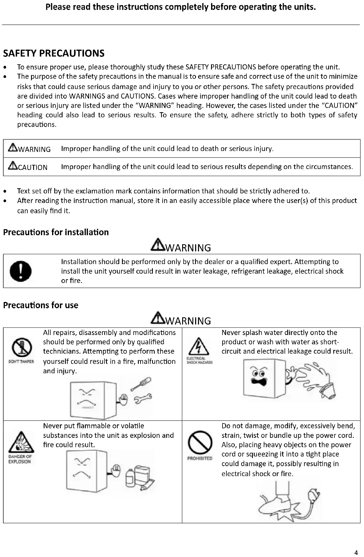 Text set off by the exclamation mark contains information that should be strictly adhered to. After reading the instruction manual, store it in an easily accessible place where the user(s) of this product can easily find it. Precautions for installation WARNING