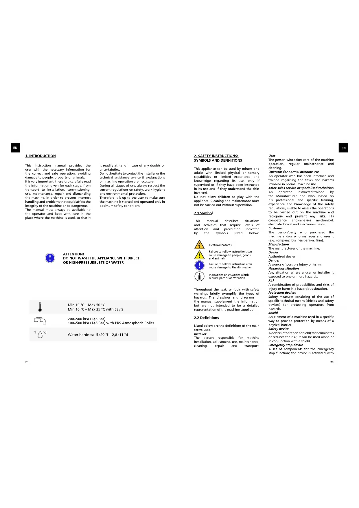Listed below are the definitions of the main terms used. Installer The person responsible for machine installation, adjustment, use, maintenance, cleaning, repair and transport. User The person who takes care of the machine operation, regular maintenance and cleaning. Operator for normal machine use An operator who has been informed and trained regarding the tasks and hazards involved in normal machine use. After-sales service or specialised technician An operator instructed/trained by the Manufacturer and who, based on his professional and specific training, experience and knowledge of the safety regulations, is able to assess the operations to be carried out on the machine and recognise and prevent any risks. His competence encompasses mechanical, electrotechnical and electronics fields. Customer The person/party who purchased the machine and/or who manages and uses it (e.g. company, businessperson, firm). Manufacturer The manufacturer of the machine. Dealer Authorised dealer. Danger A source of possible injury or harm. Hazardous situation Any situation where a user or installer is exposed to one or more hazards. Risk A combination of probabilities and risks of injury or harm in a hazardous situation. Protection devices Safety measures consisting of the use of specific technical means (shields and safety devices) for protecting operators from hazards. Shield An element of a machine used in a specific way to provide protection by means of a physical barrier. Safety device A device (other than a shield) that eliminates or reduces the risk; it can be used alone or in conjunction with a shield. Emergency stop device A set of components for the emergency stop function; the device is activated with Electrical hazards Failure to follow instructions can cause damage to people, goods and animals Indications or situations which require particular attention Failure to follow instructions can cause damage to the dishwasher3130