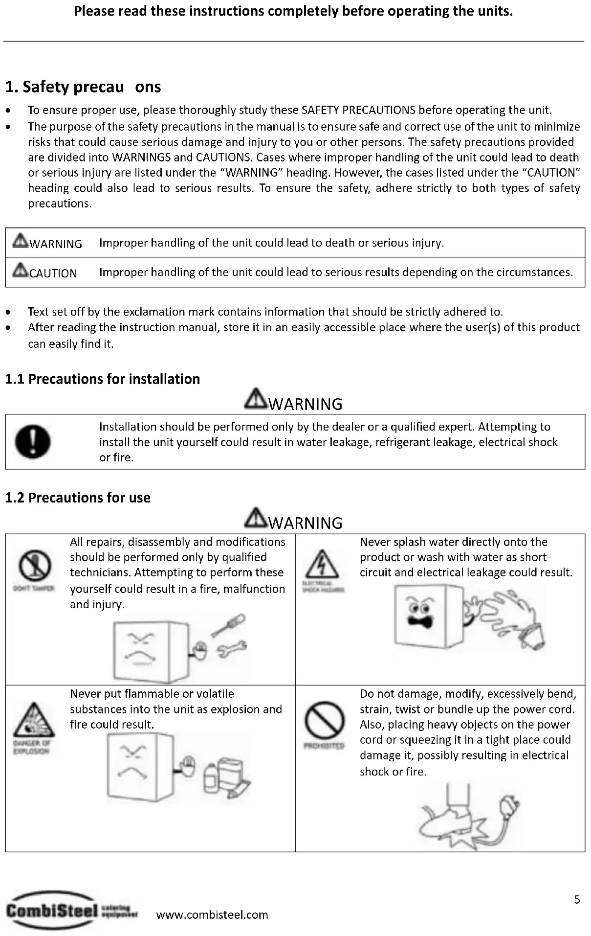 Do not damage, modify, excessively bend, strain, twist or bundle up the power cord. Also, placing heavy objects on the power cord or squeezing it in a tight place could damage it, possibly resulting in electrical shock or fire.6 www.combisteel.com