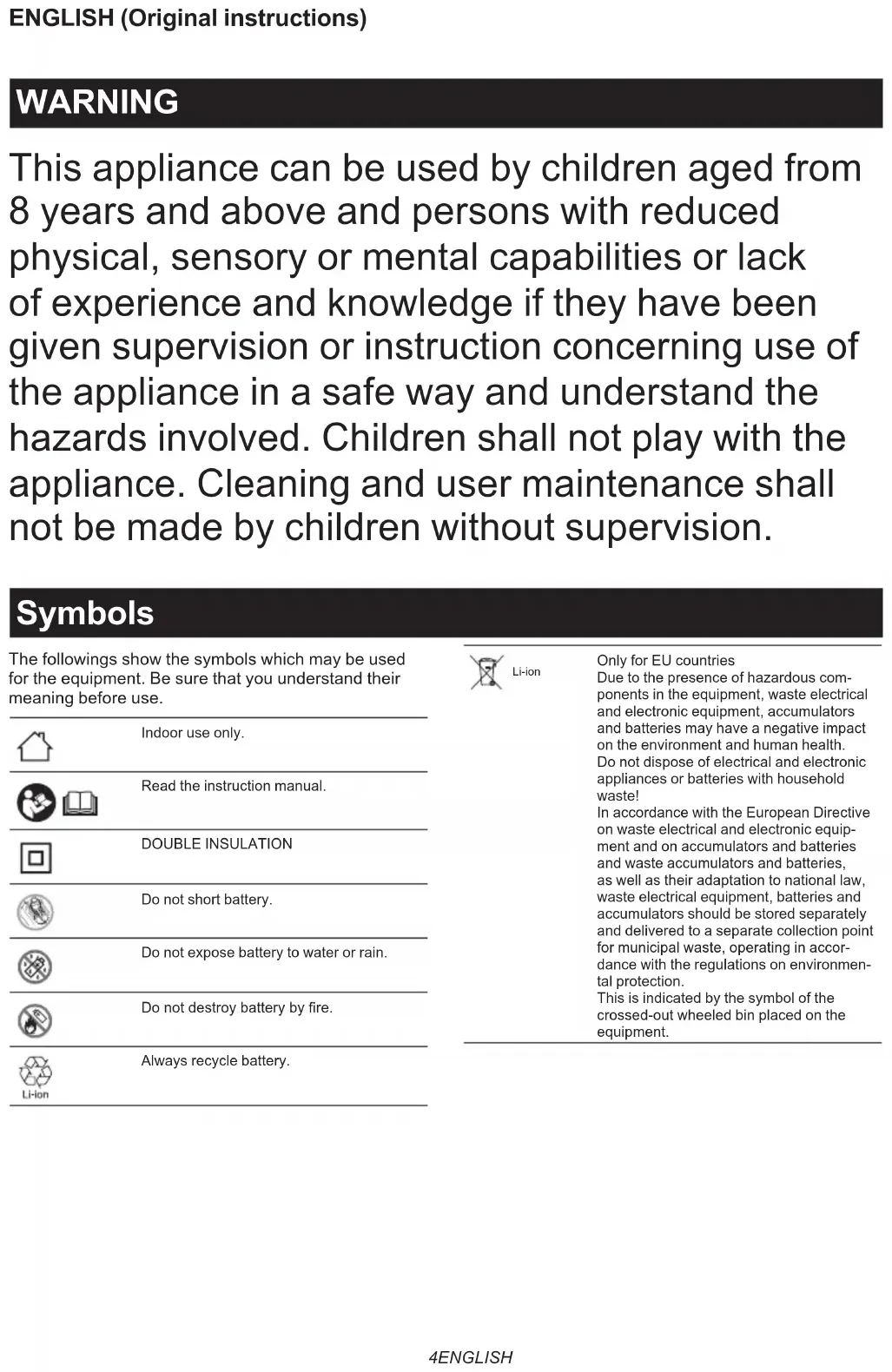 6 mm Fig.54 ENGLISH ENGLISH (Original instructions) WARNING This appliance can be used by children aged from 8 years and above and persons with reduced physical, sensory or mental capabilities or lack of experience and knowledge if they have been given supervision or instruction concerning use of the appliance in a safe way and understand the hazards involved. Children shall not play with the appliance. Cleaning and user maintenance shall not be made by children without supervision. Symbols The followings show the symbols which may be used for the equipment. Be sure that you understand their meaning before use. Indoor use only. Read the instruction manual. DOUBLE INSULATION Do not short battery. Do not expose battery to water or rain. Do not destroy battery by re. Always recycle battery. Li-ion Only for EU countries Due to the presence of hazardous com- ponents in the equipment, waste electrical and electronic equipment, accumulators and batteries may have a negative impact on the environment and human health. Do not dispose of electrical and electronic appliances or batteries with household waste! In accordance with the European Directive on waste electrical and electronic equip- ment and on accumulators and batteries and waste accumulators and batteries, as well as their adaptation to national law, waste electrical equipment, batteries and accumulators should be stored separately and delivered to a separate collection point for municipal waste, operating in accor- dance with the regulations on environmen- tal protection. This is indicated by the symbol of the crossed-out wheeled bin placed on the equipment.5 ENGLISH Ready to charge. Delay charge (Battery cooling, too cold battery, or waiting for charging). Charging (0 - 80 %). Charging (80 - 100 %). Charging complete. Charging (Cooling abnormality). Defective battery. CAUTION