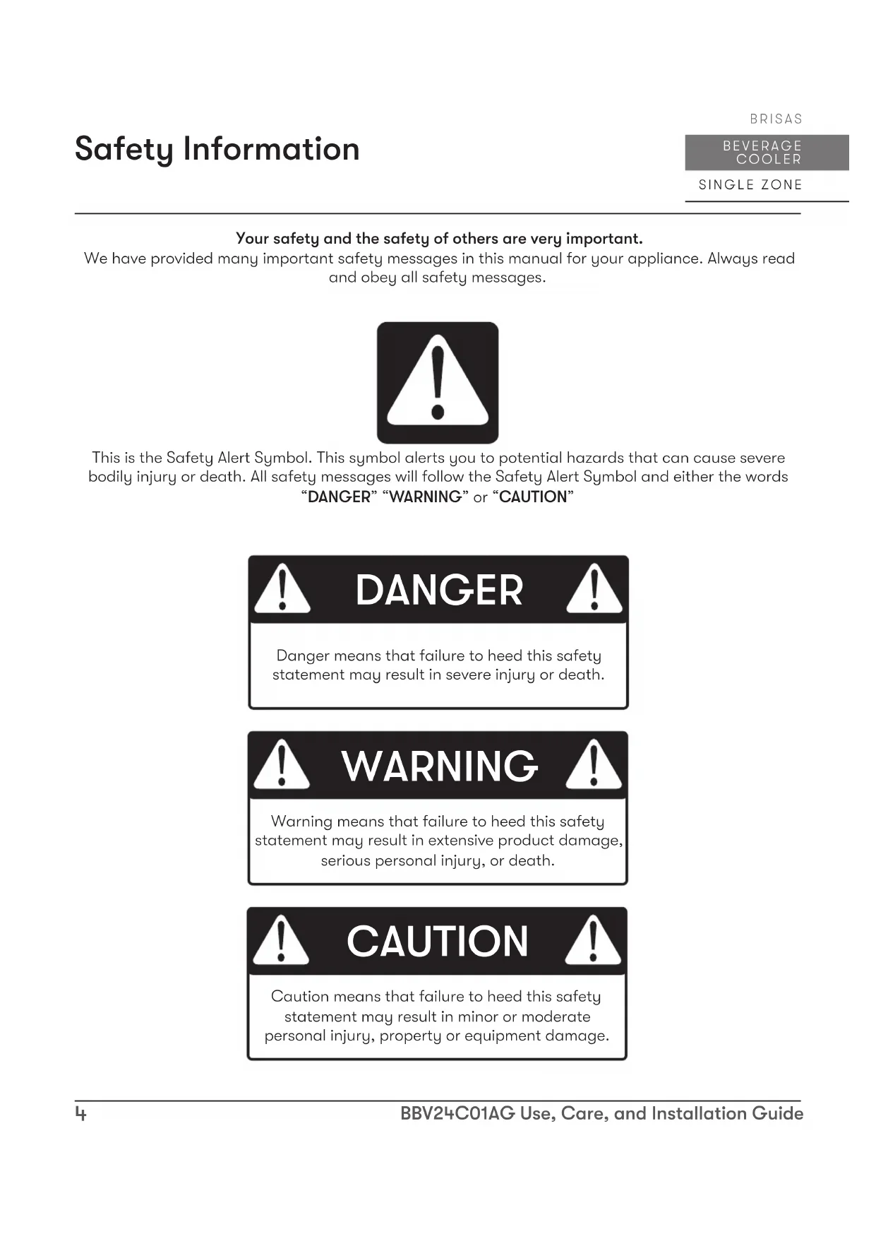 Safety Information Your safety and the safety of others are very important. We have provided many important safety messages in this manual for your appliance. Always read and obey all safety messages. This is the Safety Alert Symbol. This symbol alerts you to potential hazards that can cause severe bodily injury or death. All safety messages will follow the Safety Alert Symbol and either the words “DANGER” “WARNING” or “CAUTION” DANGER WARNING CAUTION Danger means that failure to heed this safety statement may result in severe injury or death. Warning means that failure to heed this safety statement may result in extensive product damage, serious personal injury, or death. Caution means that failure to heed this safety statement may result in minor or moderate personal injury, property or equipment damage.5 BBV24C01AG Use, Care, and Installation Guide Safety Information When using an electrical appliance, basic precautions should always be followed to reduce the risk of fire, electric shock, and injury to persons. DANGER For your safety, read all instructions carefully before operating the appliance.To reduce the risk of fire, electric shock or personal injury, unplug or disconnect the appliance from the power supply before servicing. WARNING Flammable refrigerant used! When handling, moving and use of the refrigerator, make sure to avoid either damaging the refrigerant tubing, or increasing the risk of a leak. CAUTION ► Use this appliance only as described in this manual. Other uses not recommended may cause fire, electric shock or personal injury. ► This appliance is not intended for use by young children or infirm persons unless they have been adequately supervised by a responsible person to ensure that they can use the appliance safely. ► Young children should be supervised to ensure that they never play with the appliance. ► To protect against the risk of electric shock, NEVER IMMERSE the unit, cord, or plug in water or spray any other liquid. ► Unplug the appliance from the plug socket when not in use, when moving from one location to another and before cleaning. General Safety6 BBV24C01AG Use, Care, and Installation Guide
