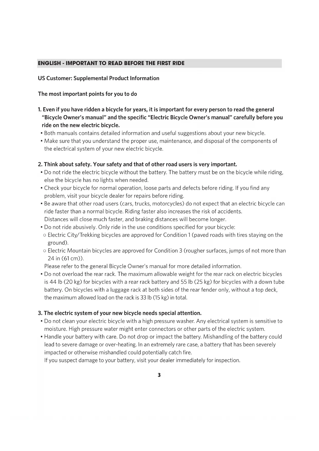 - Do not ride abusively. Only ride in the use conditions specified for your bicycle: ○ Electric City/Trekking bicycles are approved for Condition 1 (paved roads with tires staying on the ground). ○ Electric Mountain bicycles are approved for Condition 3 (rougher surfaces, jumps of not more than 24 in (61 cm)). Please refer to the general Bicycle Owner’s manual for more detailed information.