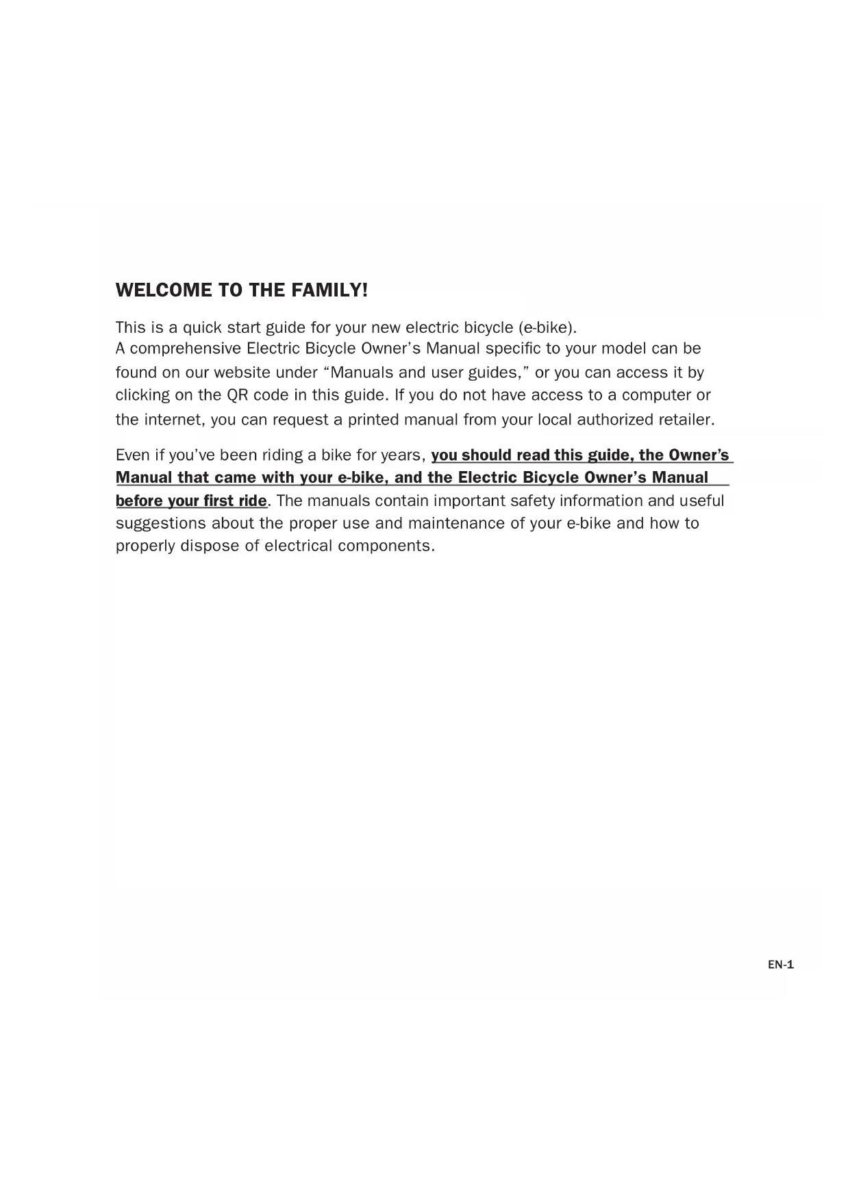 5257278GOE_5257279BGS_Quick_Start_manual_Bosch_systems_MY20_inside_EN_DE_FR_ES_125x125_CMYK_FINAL_3.indd 35257278GOE_5257279BGS_Quick_Start_manual_Bosch_systems_MY20_inside_EN_DE_FR_ES_125x125_CMYK_FINAL_3.indd 303-Aug-20 15:21:5003-Aug-20 15:21:50EN-1 WELCOME TO THE FAMILY! This is a quick start guide for your new electric bicycle (e-bike). A comprehensive Electric Bicycle Owner’s Manual specic to your model can be found on our website under “Manuals and user guides,” or you can access it by clicking on the QR code in this guide. If you do not have access to a computer or the internet, you can request a printed manual from your local authorized retailer. Even if you’ve been riding a bike for years, you should read this guide, the Owner’s Manual that came with your e-bike, and the Electric Bicycle Owner’s Manual before your rst ride. The manuals contain important safety information and useful suggestions about the proper use and maintenance of your e-bike and how to properly dispose of electrical components. 5257278GOE_5257279BGS_Quick_Start_manual_Bosch_systems_MY20_inside_EN_DE_FR_ES_125x125_CMYK_FINAL_3.indd 15257278GOE_5257279BGS_Quick_Start_manual_Bosch_systems_MY20_inside_EN_DE_FR_ES_125x125_CMYK_FINAL_3.indd 103-Aug-20 15:21:5003-Aug-20 15:21:50EN-2 FIVE THINGS YOU NEED TO KNOW ABOUT RIDING YOUR NEW E-BIKE