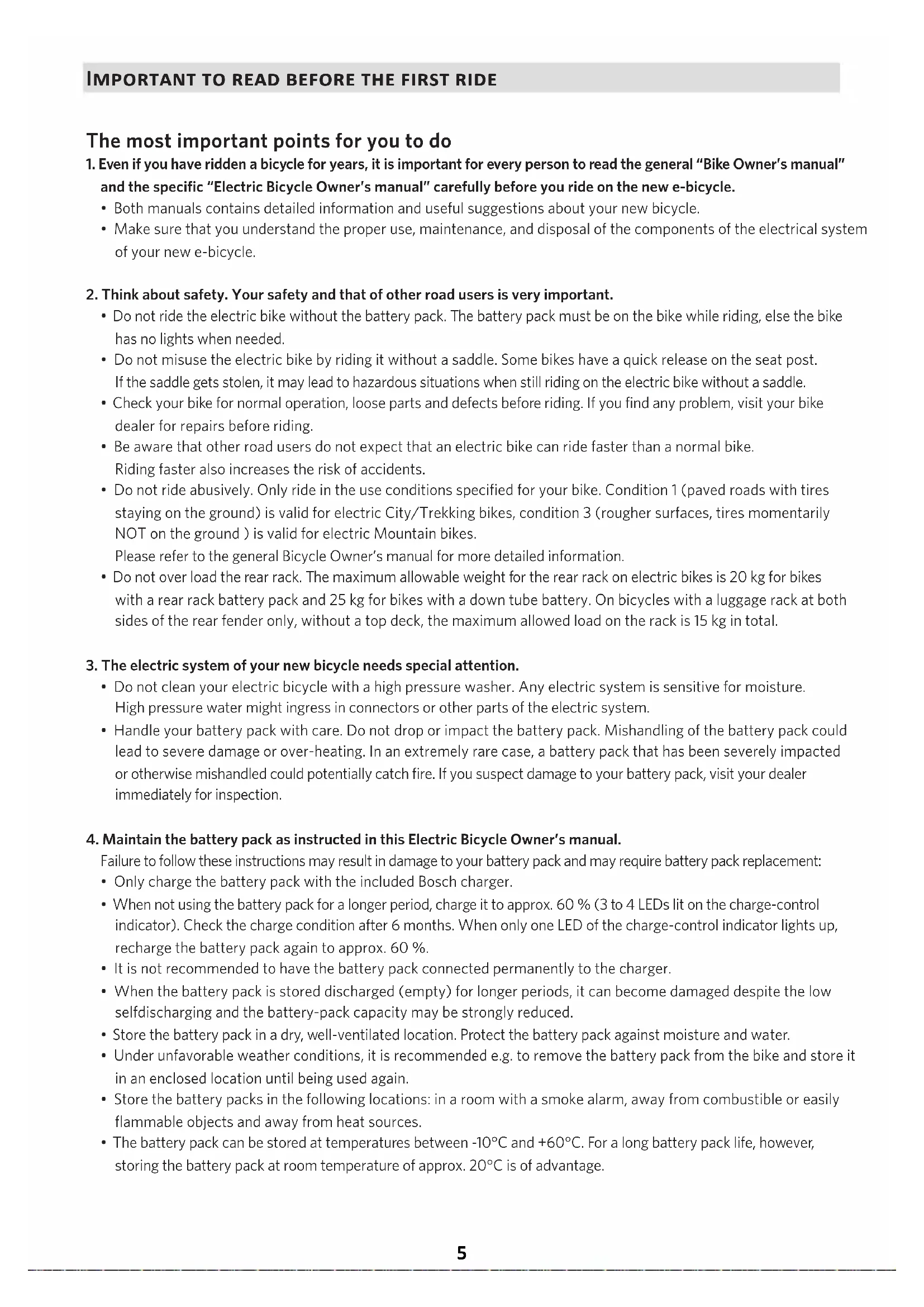 Contact - Kontakt - Contact - Contacter........................................................................................................................................................................................................ 365 Contents - Inhalt - Inhoud - MatièresImportant to read before the first ride The most important points for you to do 1. Even if you have ridden a bicycle for years, it is important for every person to read the general “Bike Owner’s manual” and the specific “Electric Bicycle Owner’s manual” carefully before you ride on the new e-bicycle.