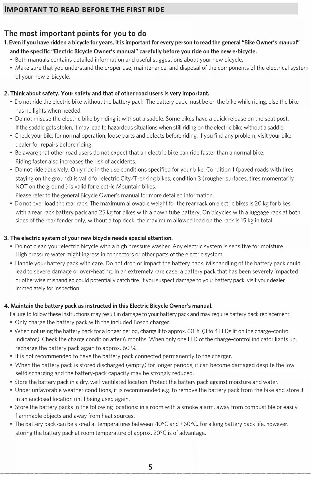 Contact - Kontakt - Contact - Contacter........................................................................................................................................................................................................ 365 Contents - Inhalt - Inhoud - MatièresImportant to read before the first ride The most important points for you to do 1. Even if you have ridden a bicycle for years, it is important for every person to read the general “Bike Owner’s manual” and the specific “Electric Bicycle Owner’s manual” carefully before you ride on the new e-bicycle.