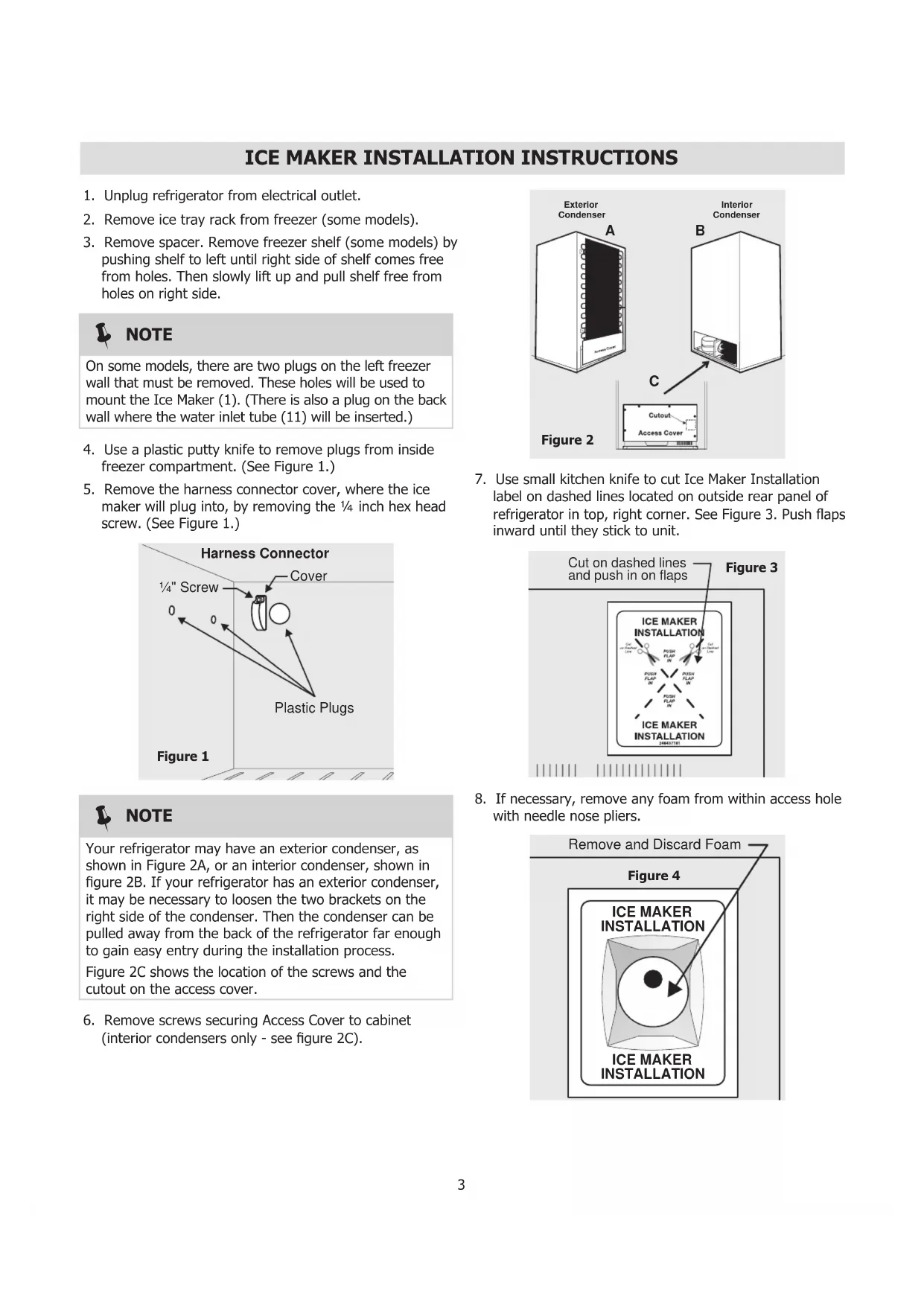 NOTE Your refrigerator may have an exterior condenser, as shown in Figure 2A, or an interior condenser, shown in gure 2B. If your refrigerator has an exterior condenser, it may be necessary to loosen the two brackets on the right side of the condenser. Then the condenser can be pulled away from the back of the refrigerator far enough to gain easy entry during the installation process. Figure 2C shows the location of the screws and the cutout on the access cover.